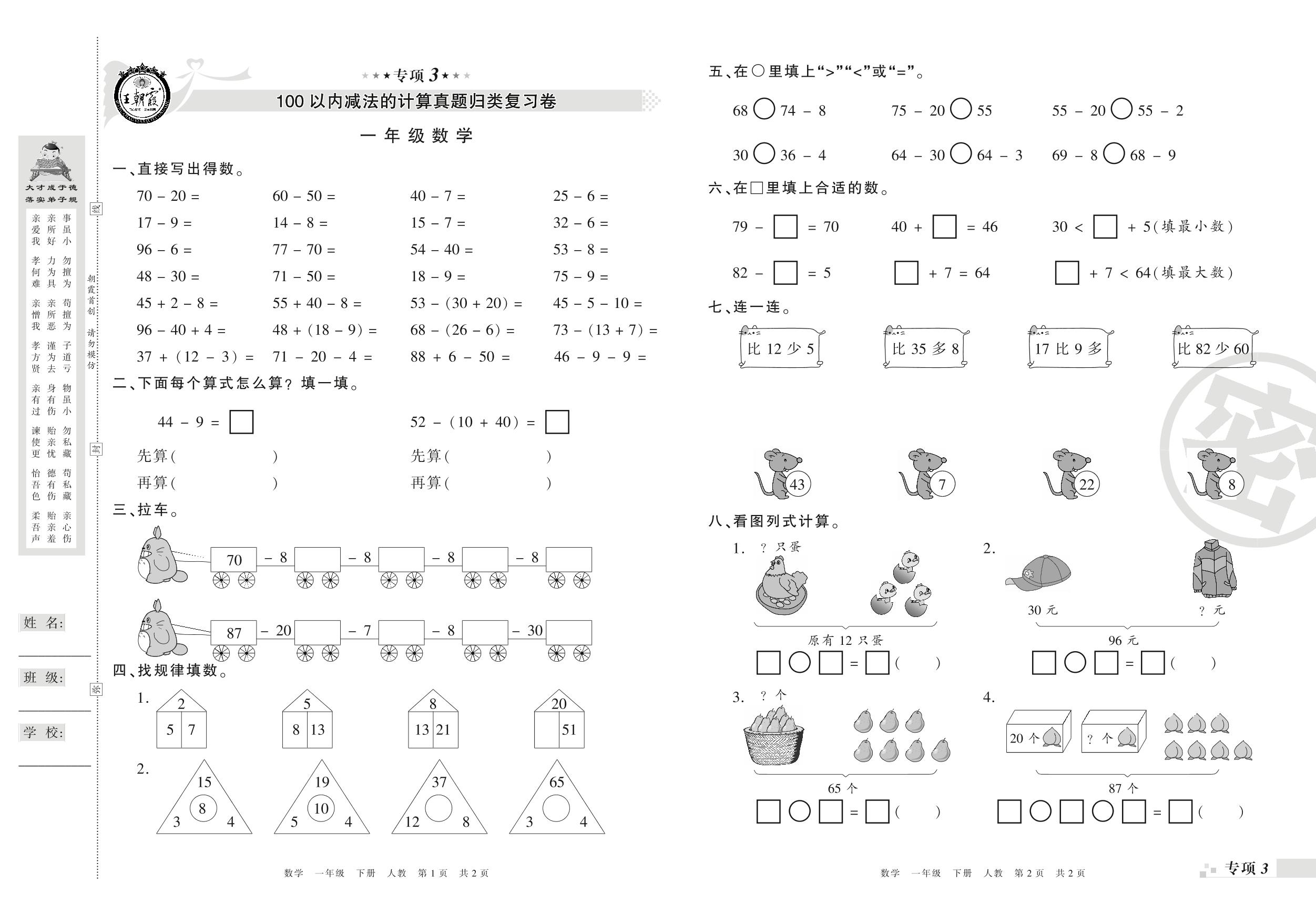 王朝霞期末专项卷——100以内减法的计算、100以内加法和减法的应用真题归类复习卷一年级下册数学(人教版)_R210802220213【0】