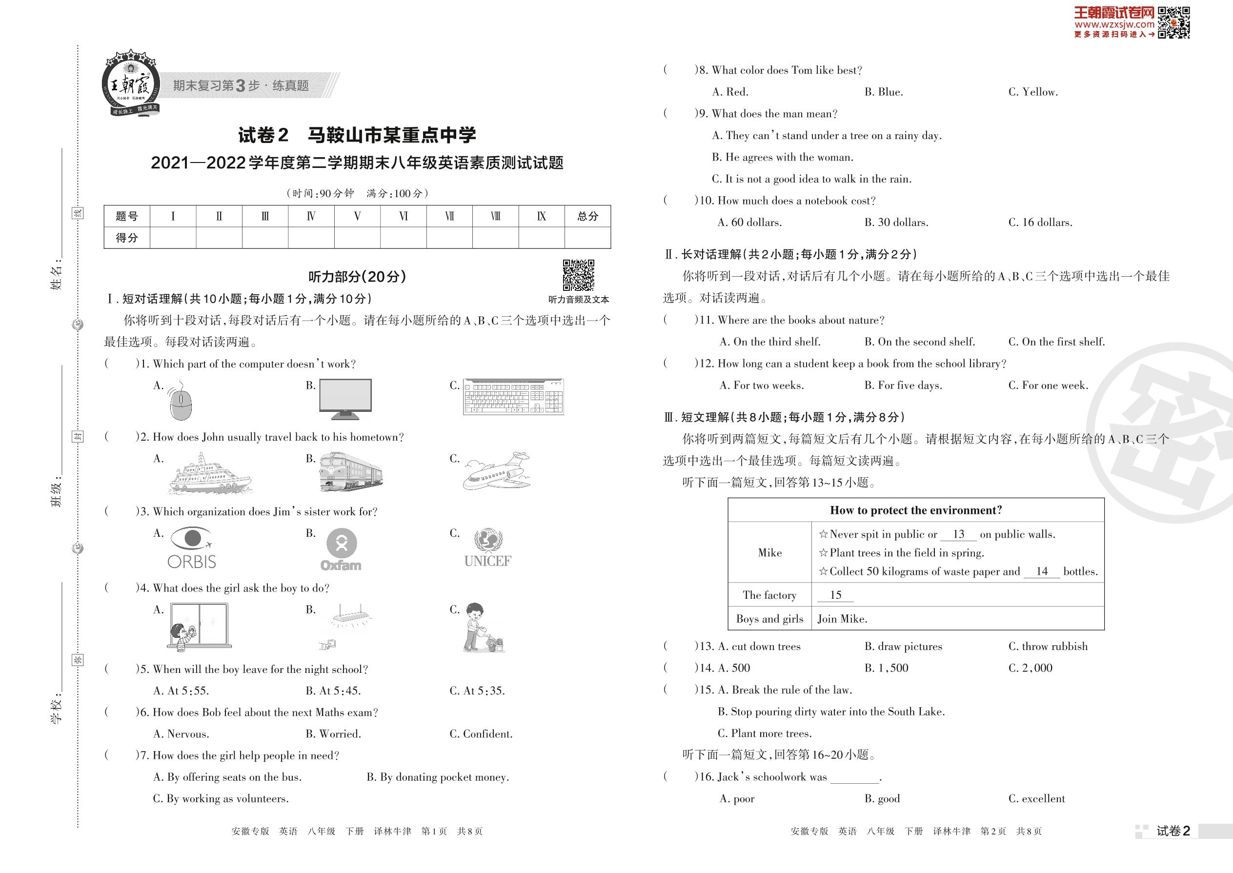 马鞍山市某重点中学2021—2022学年度第二学期期末八年级英语素质测试试题(译林牛津版)【2】