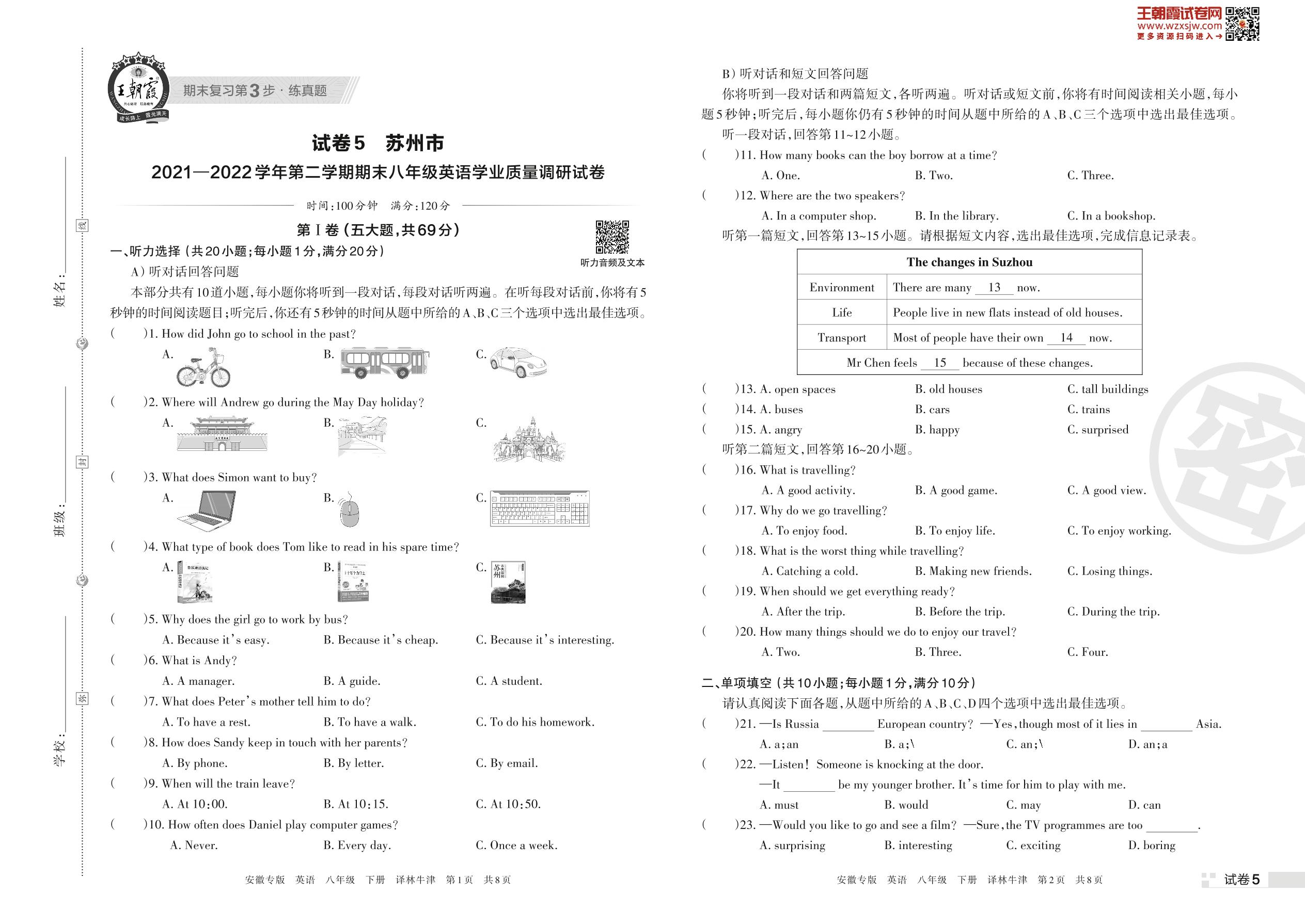苏州市2021—2022学年第二学期期末八年级英语学业质量调研试卷(译林牛津版)【5】
