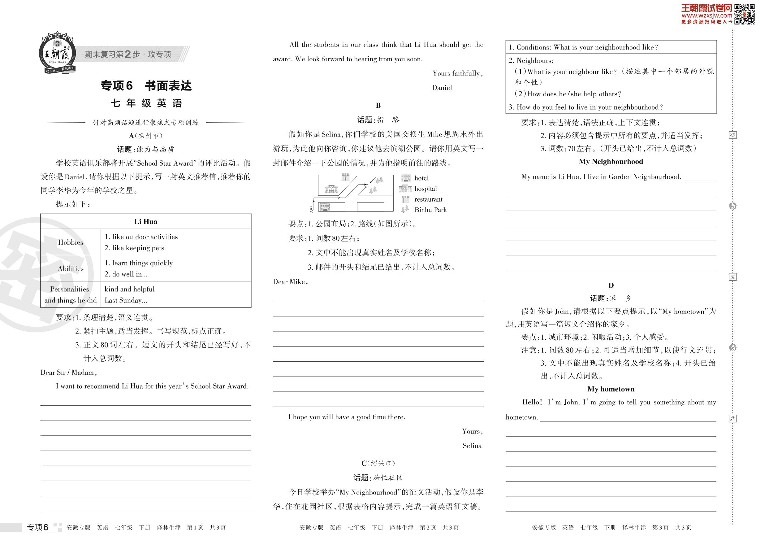 王朝霞期末专项卷——书面表达七年级下册英语(译林牛津版)_R230424152942557【6】