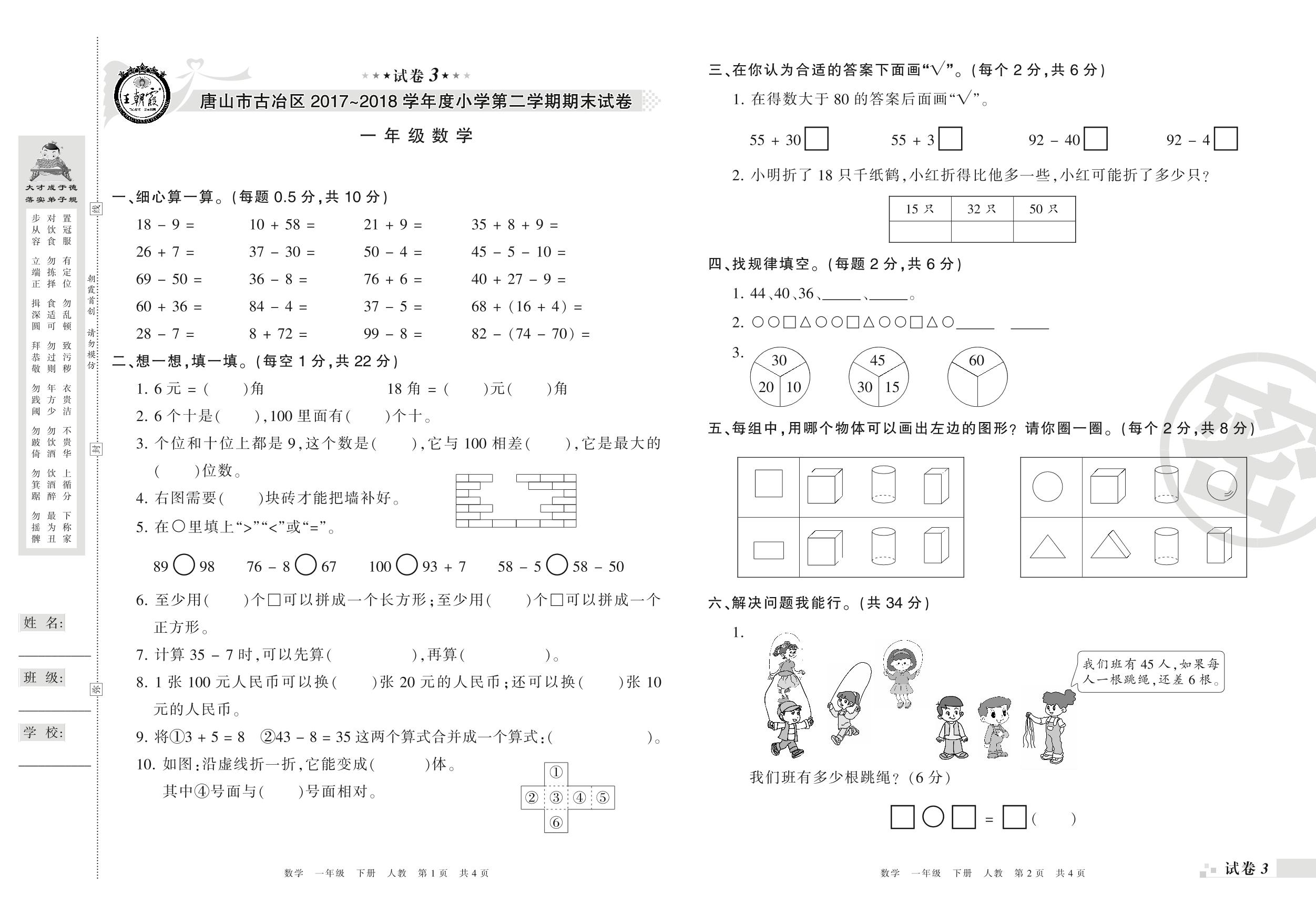 2017-2018学年第二学期唐山市古冶区一年级数学试卷(人教版)【3】