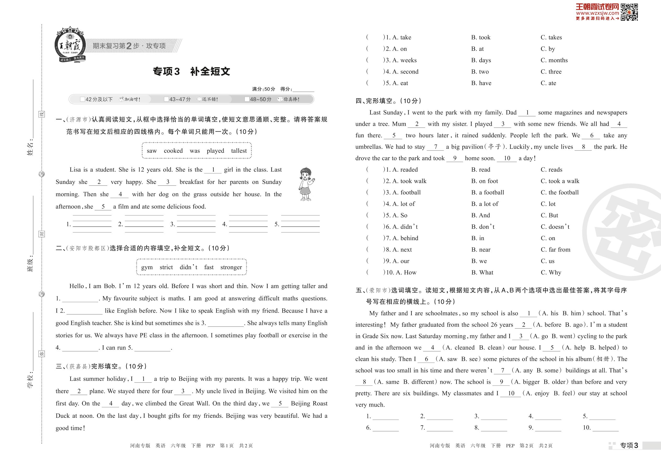 王朝霞期末专项卷——补全短文六年级下册英语(PEP版)_R230424162418103【3】