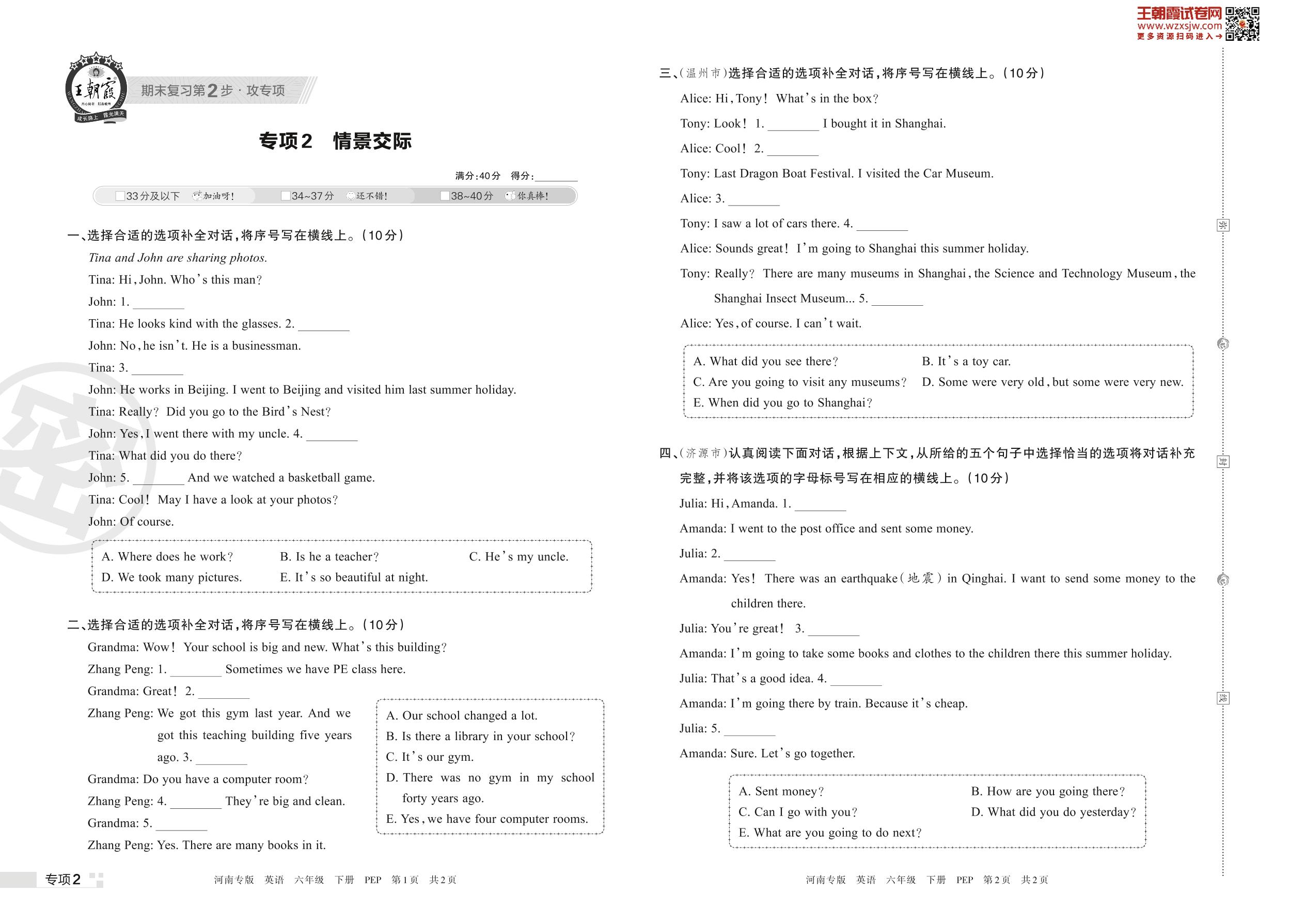 王朝霞期末专项卷——情景交际六年级下册英语(PEP版)_R230424162419413【2】