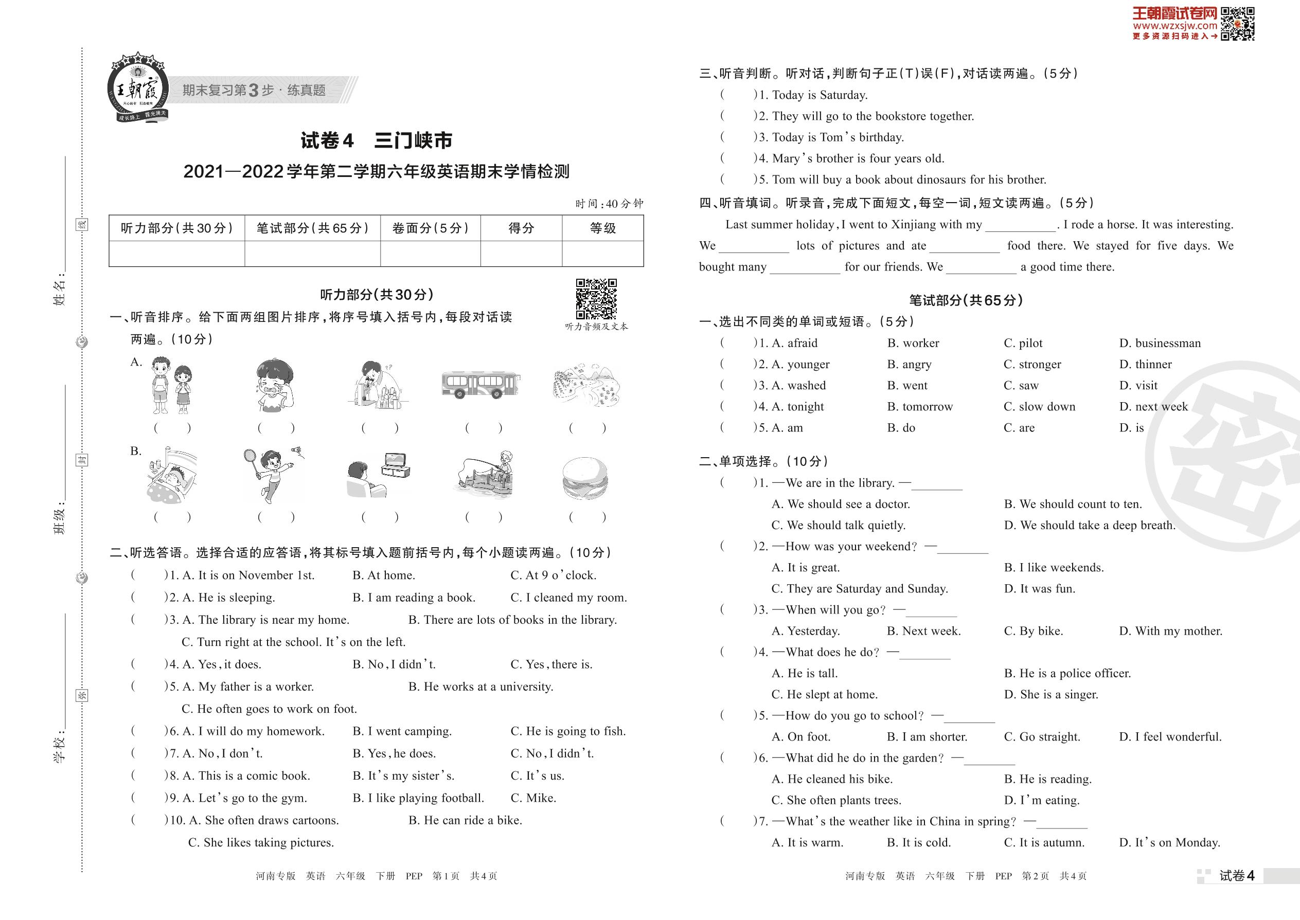 三门峡市2021—2022学年第二学期六年级英语期末学情检测(PEP版)【4】