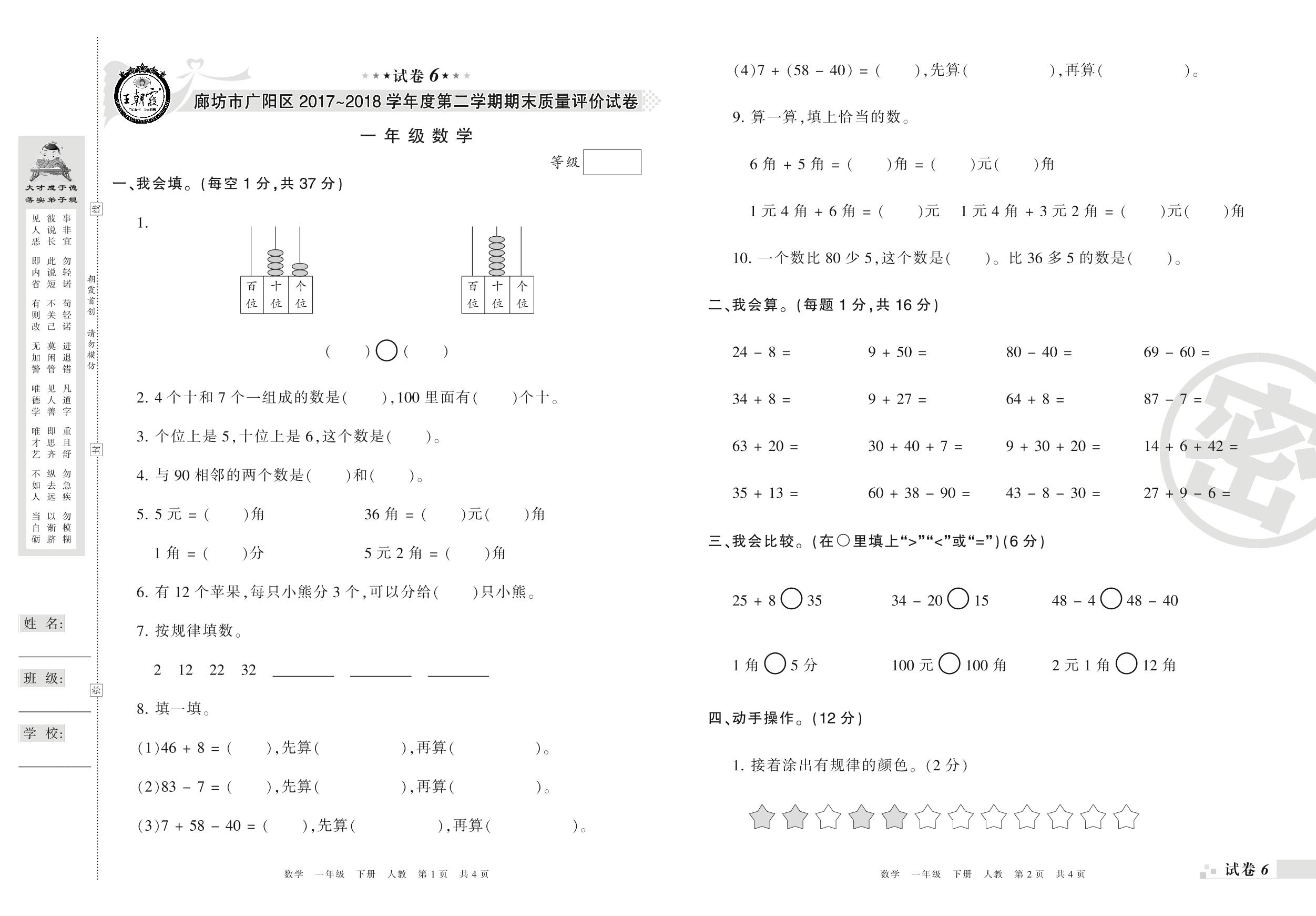 2017-2018学年第二学期廊坊市广阳区一年级数学试卷(人教版)【6】