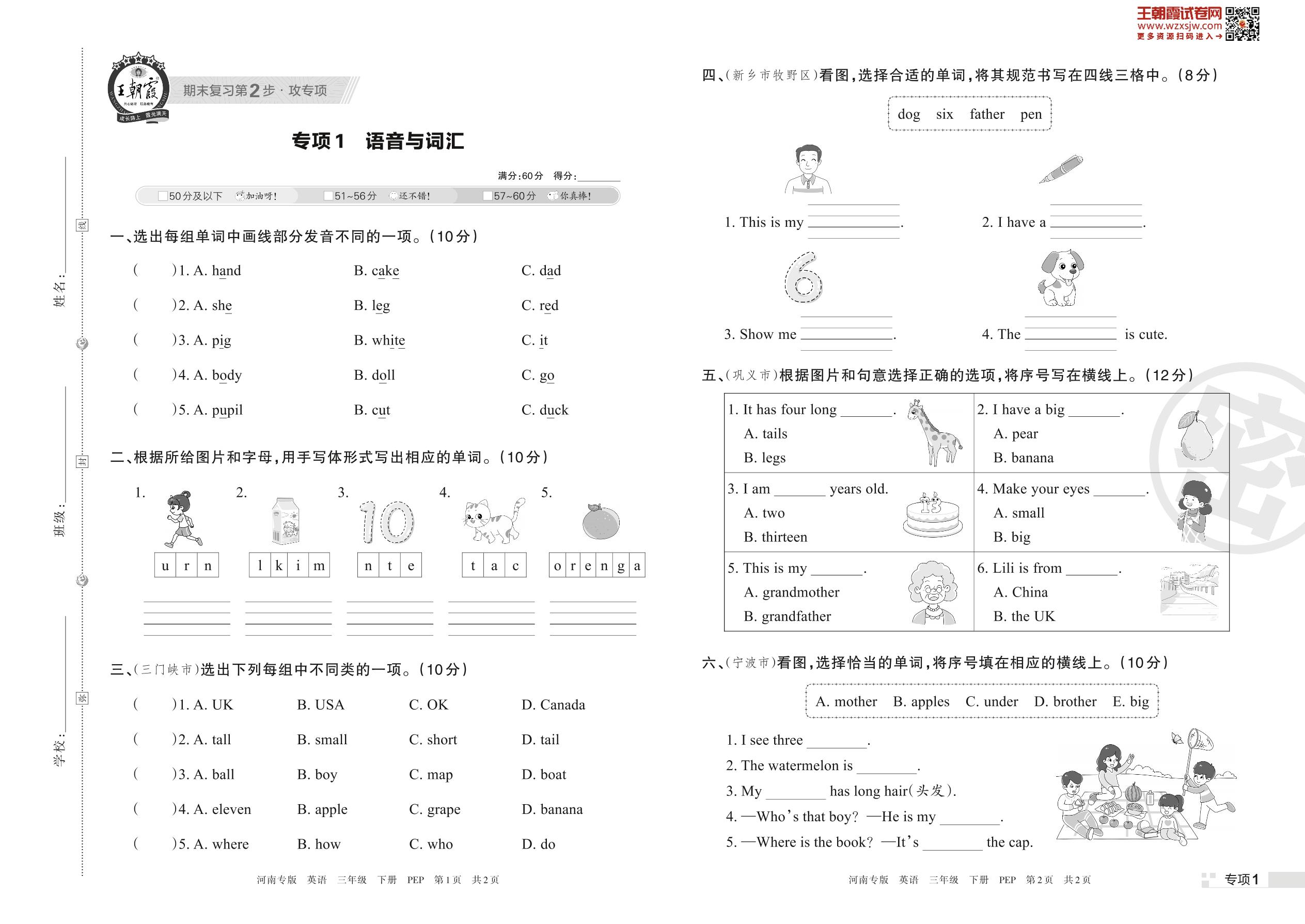 王朝霞期末专项卷——语音与词汇三年级下册英语(PEP版)_R230424165353382【1】