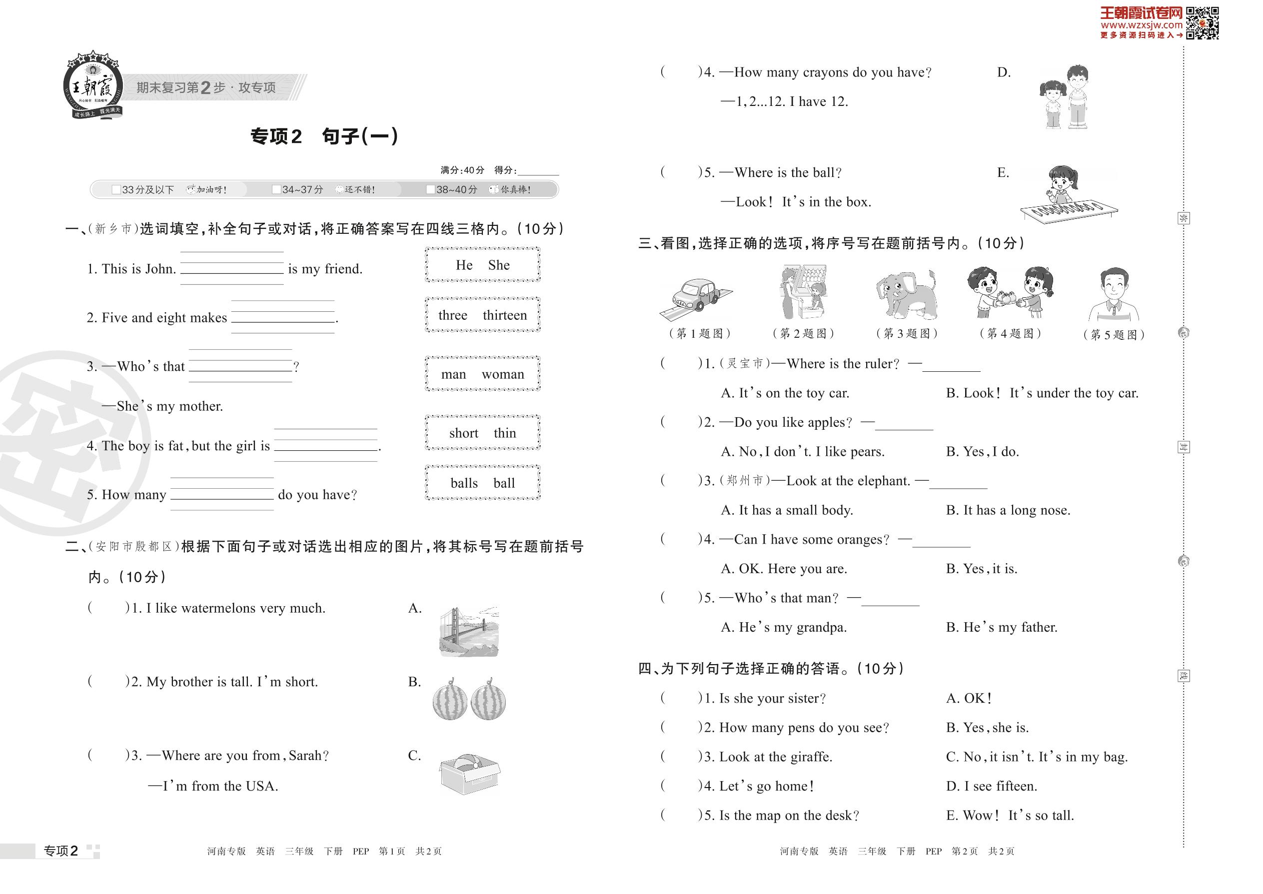 王朝霞期末专项卷——句子(一)三年级下册英语(PEP版)_R230424165353975【2】