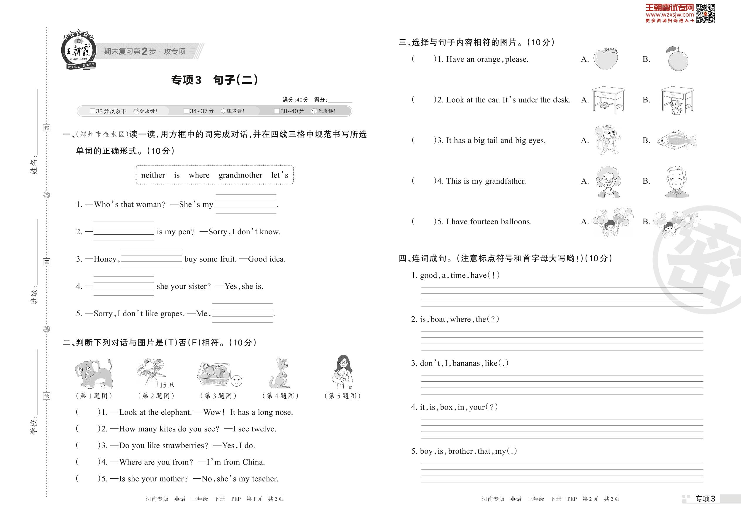 王朝霞期末专项卷——句子(二)三年级下册英语(PEP版)_R230424165353018【3】
