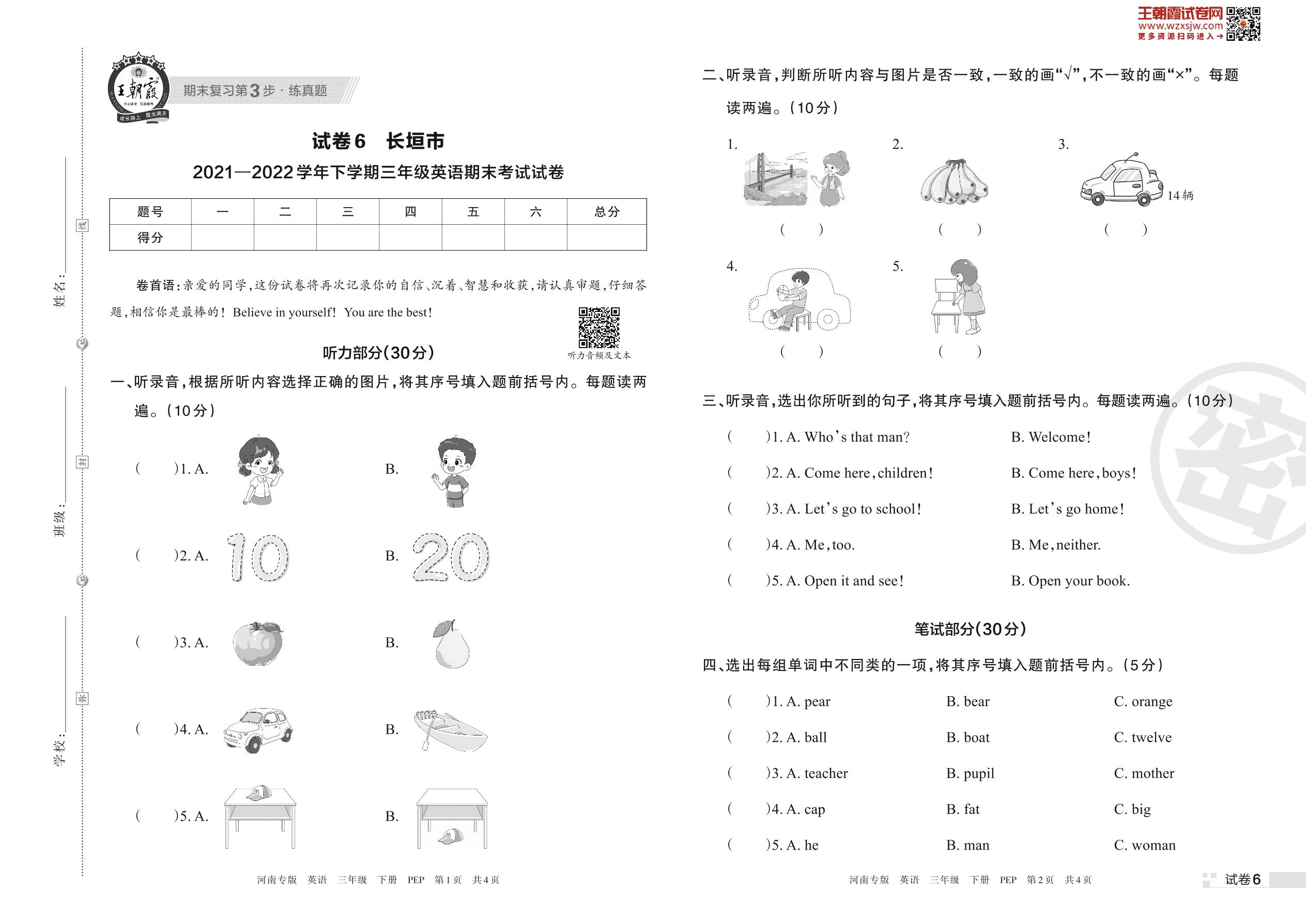 长垣市2021—2022学年下学期三年级英语期末考试试卷(PEP版)【6】