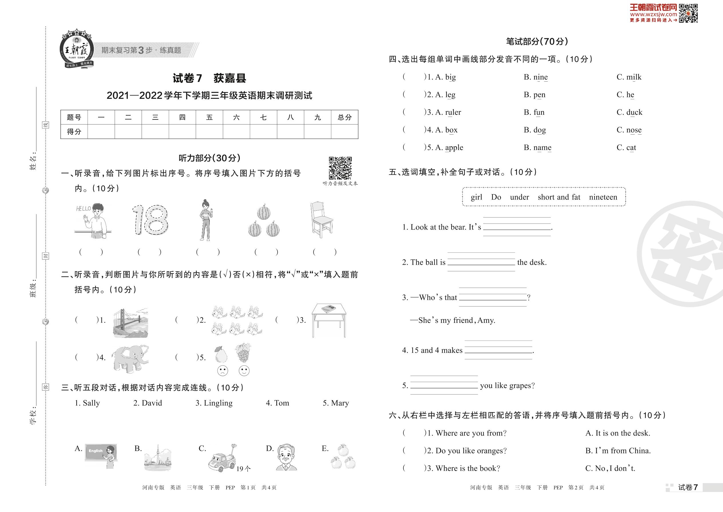 获嘉县2021—2022学年下学期三年级英语期末调研测试(PEP版)【7】