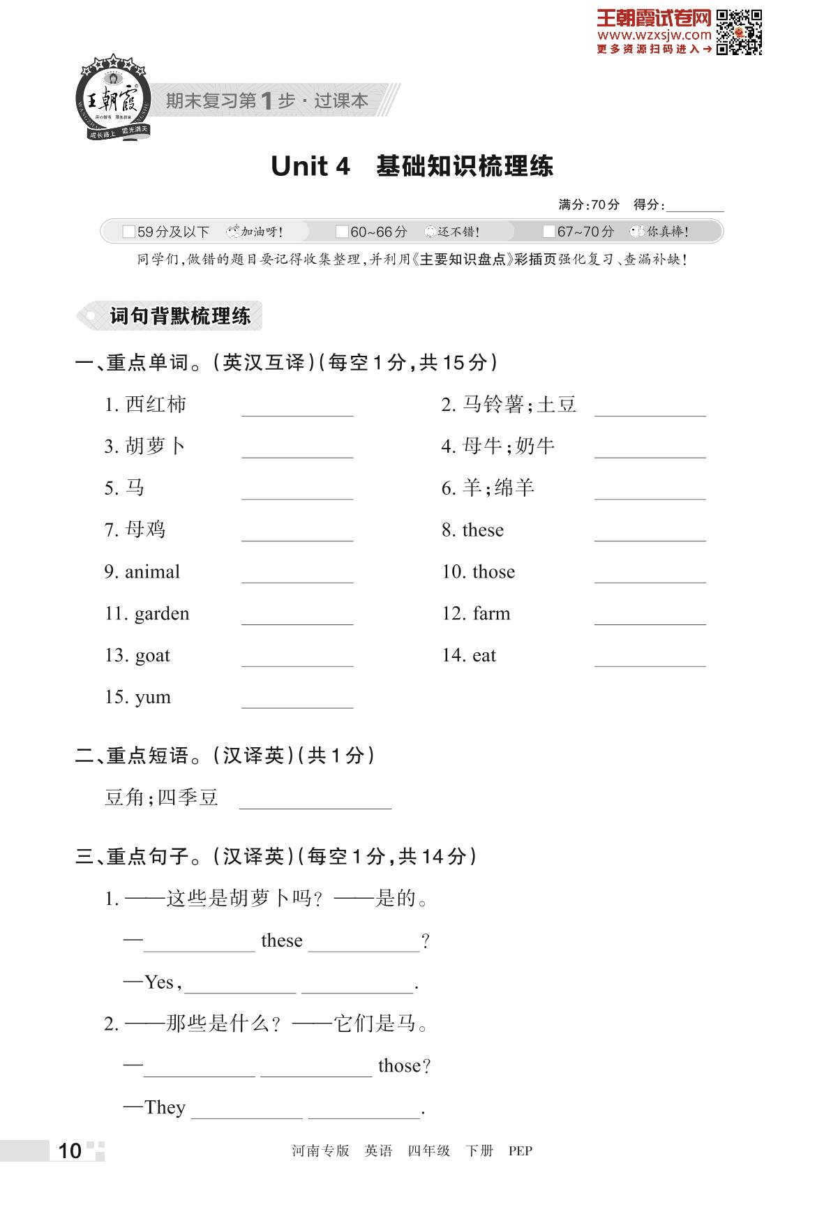 王朝霞期末过课本——Unit 4 基础知识梳理练四年级下册英语(PEP版)_R230424170528849