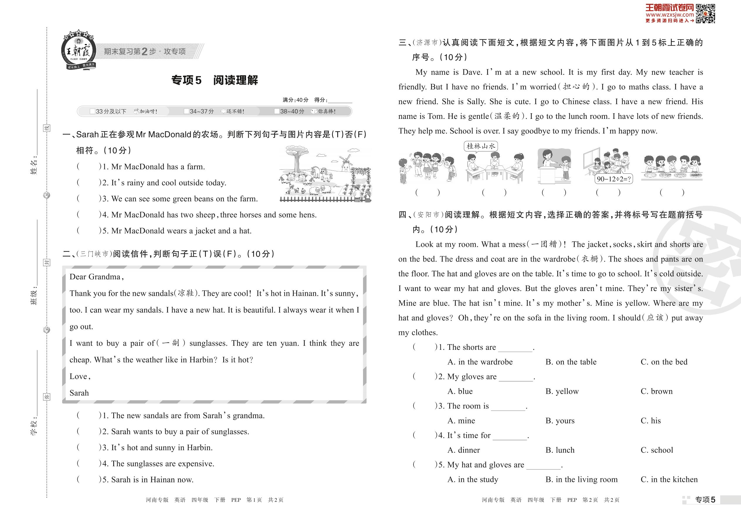 王朝霞期末专项卷——阅读理解四年级下册英语(PEP版)_R230424170529664【5】