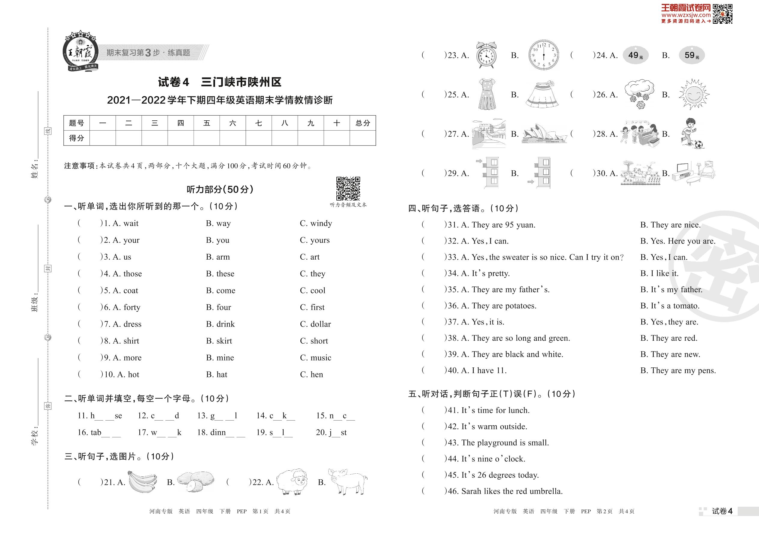 三门峡市陕州区2021—2022学年下期四年级英语期末学情教情诊断(PEP版)【4】