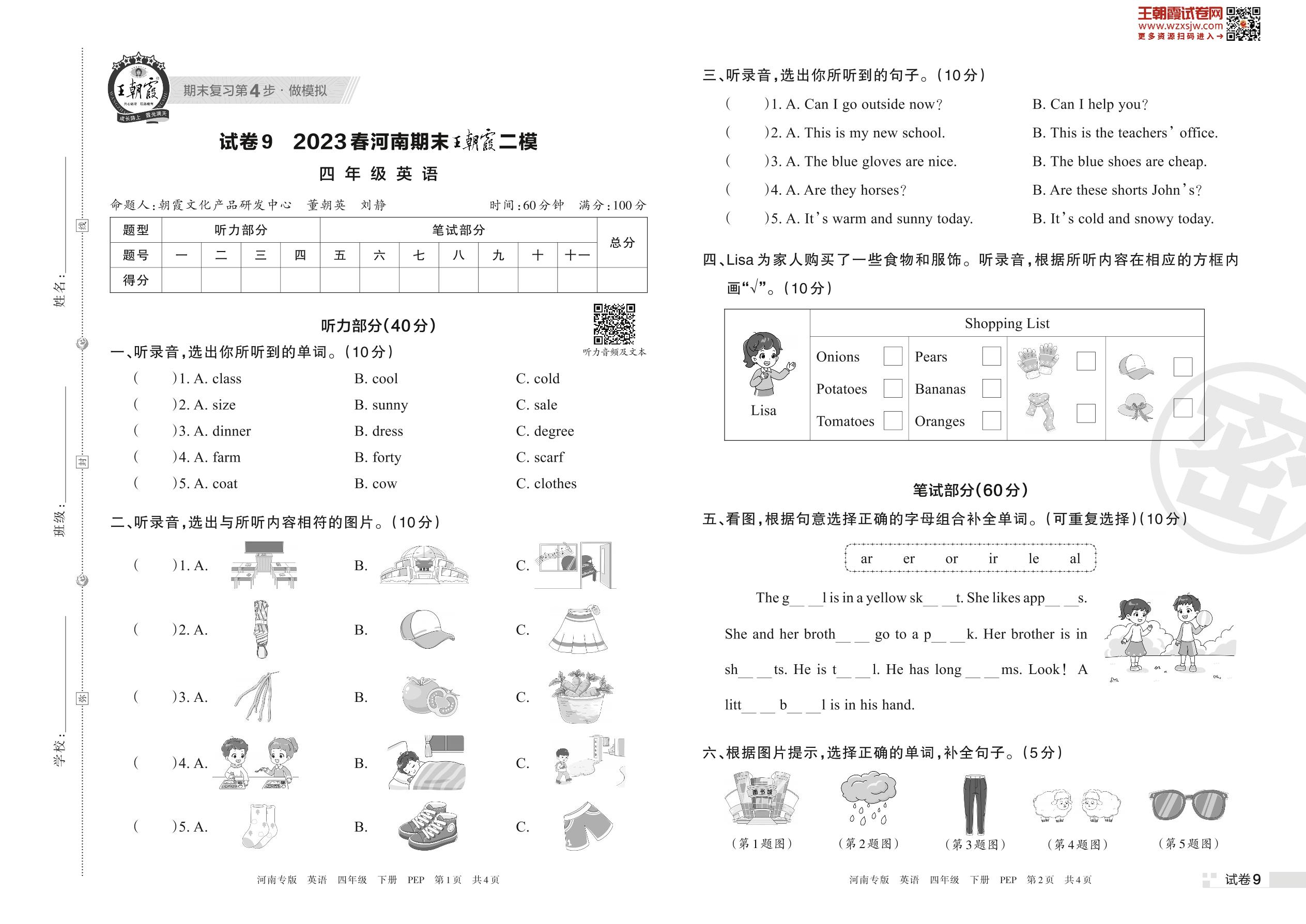 王朝霞期末模拟卷四年级下册英语(PEP版)_R230424170530467【9】