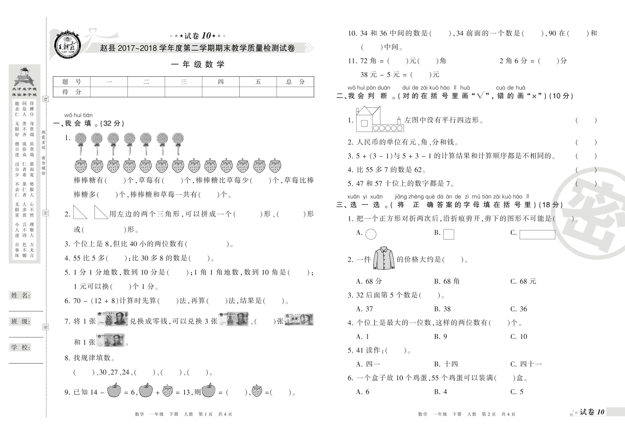一年级数学人教版下册期末卷