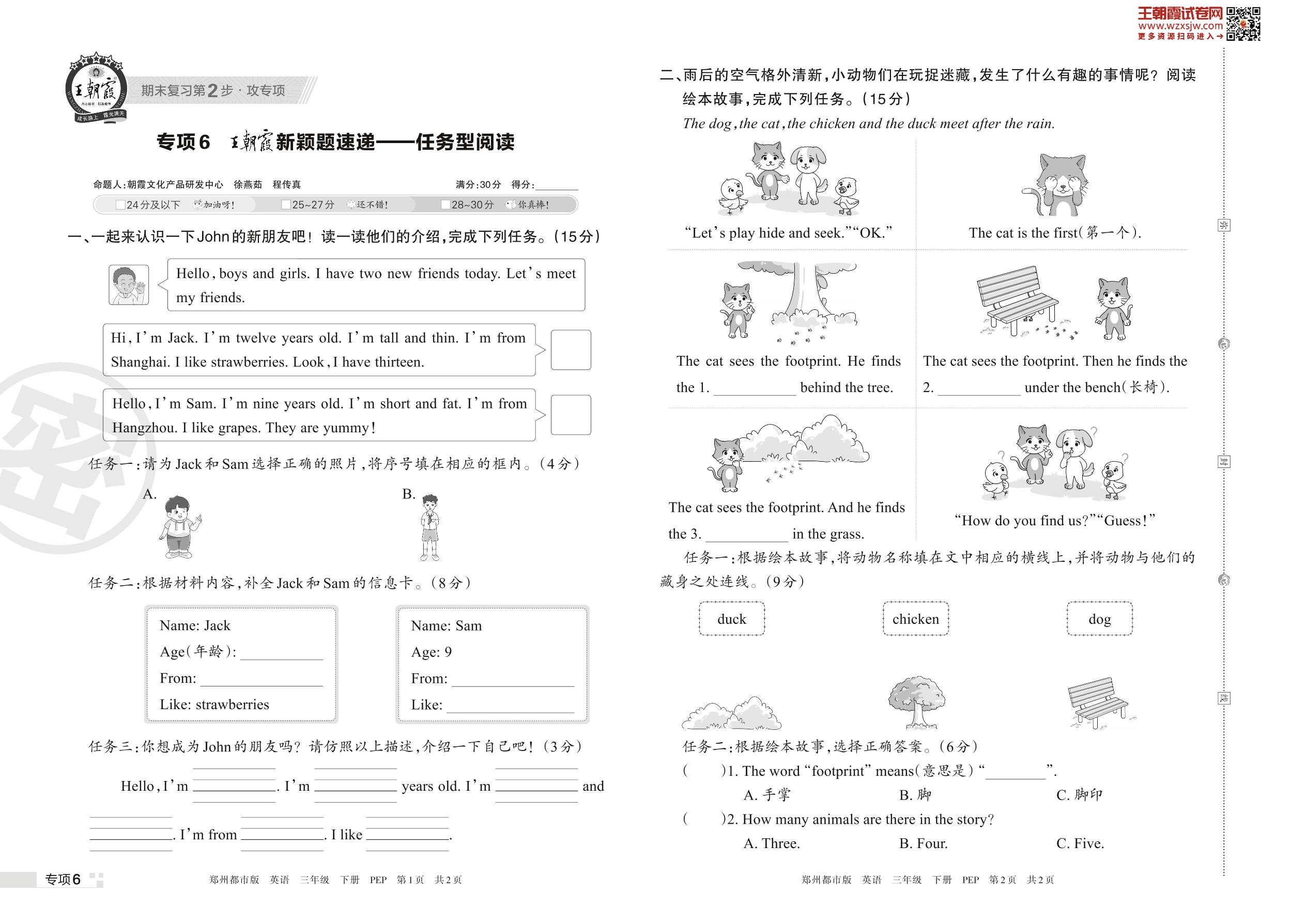 王朝霞期末专项卷——王朝霞新颖题速递:任务型阅读三年级下册英语(PEP版)_R230424171826425【6】