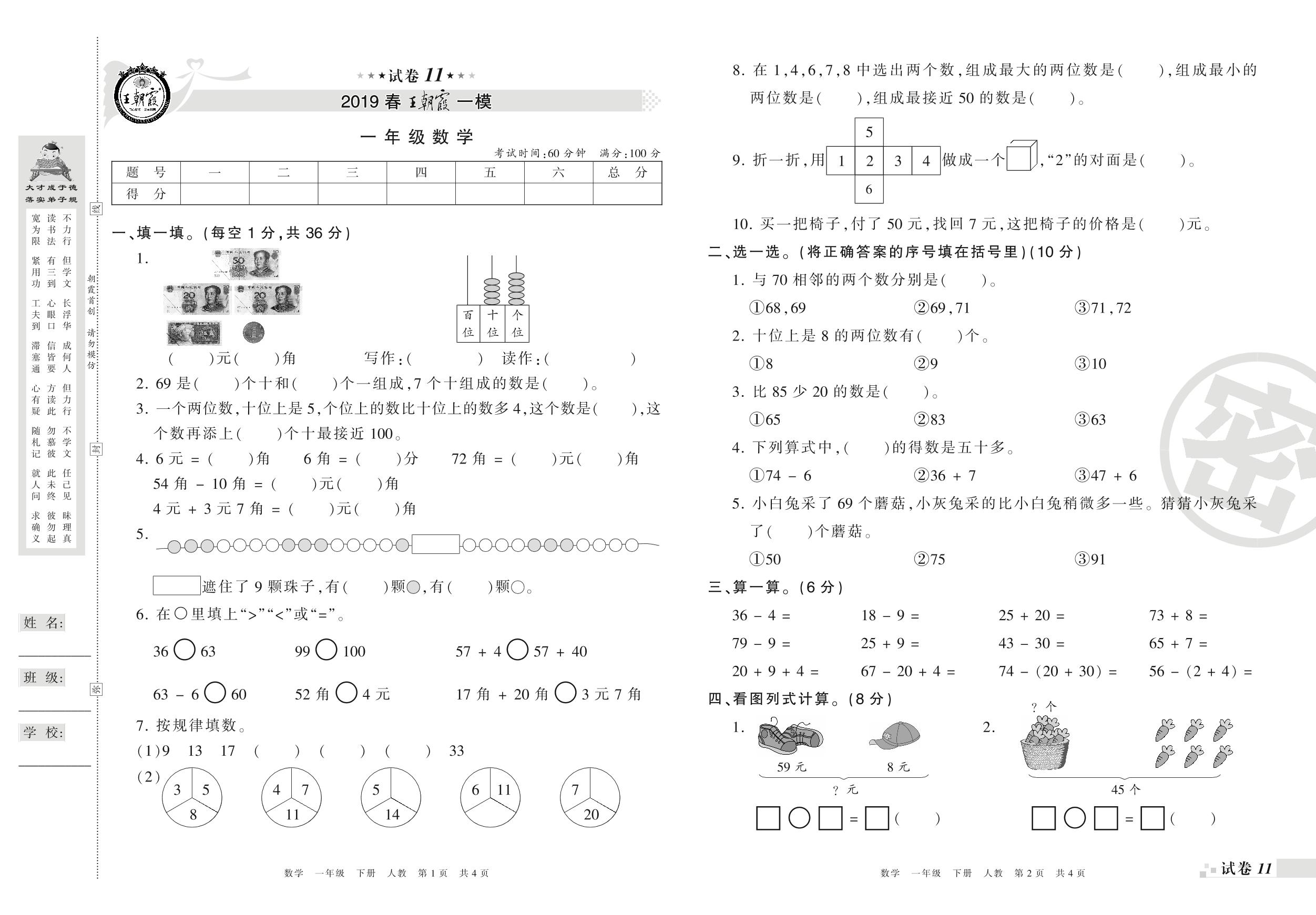 王朝霞期末模拟卷一年级下册数学(人教版)_R210802220258【11】