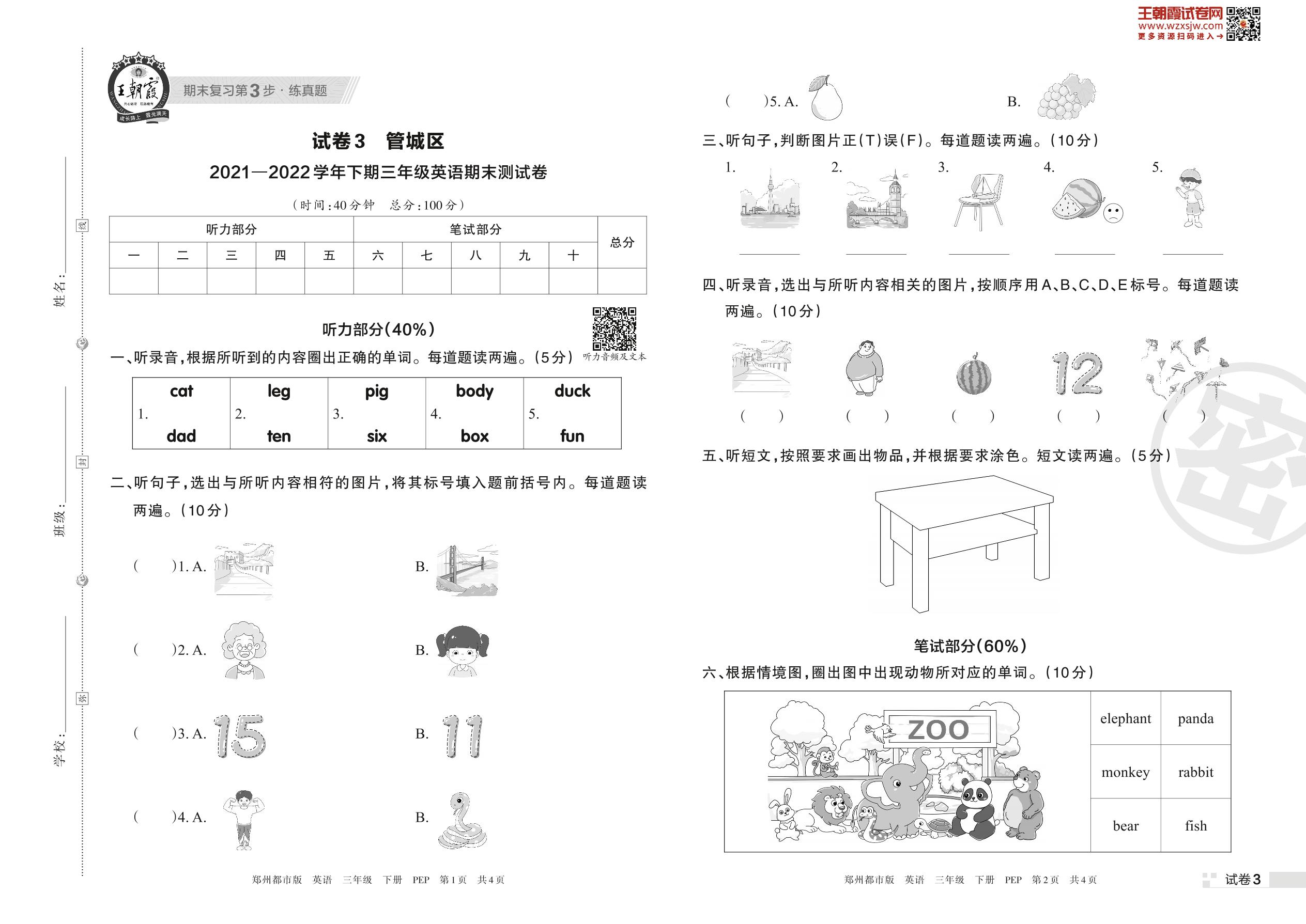管城区2021—2022学年下期三年级英语期末测试卷(PEP版)【3】