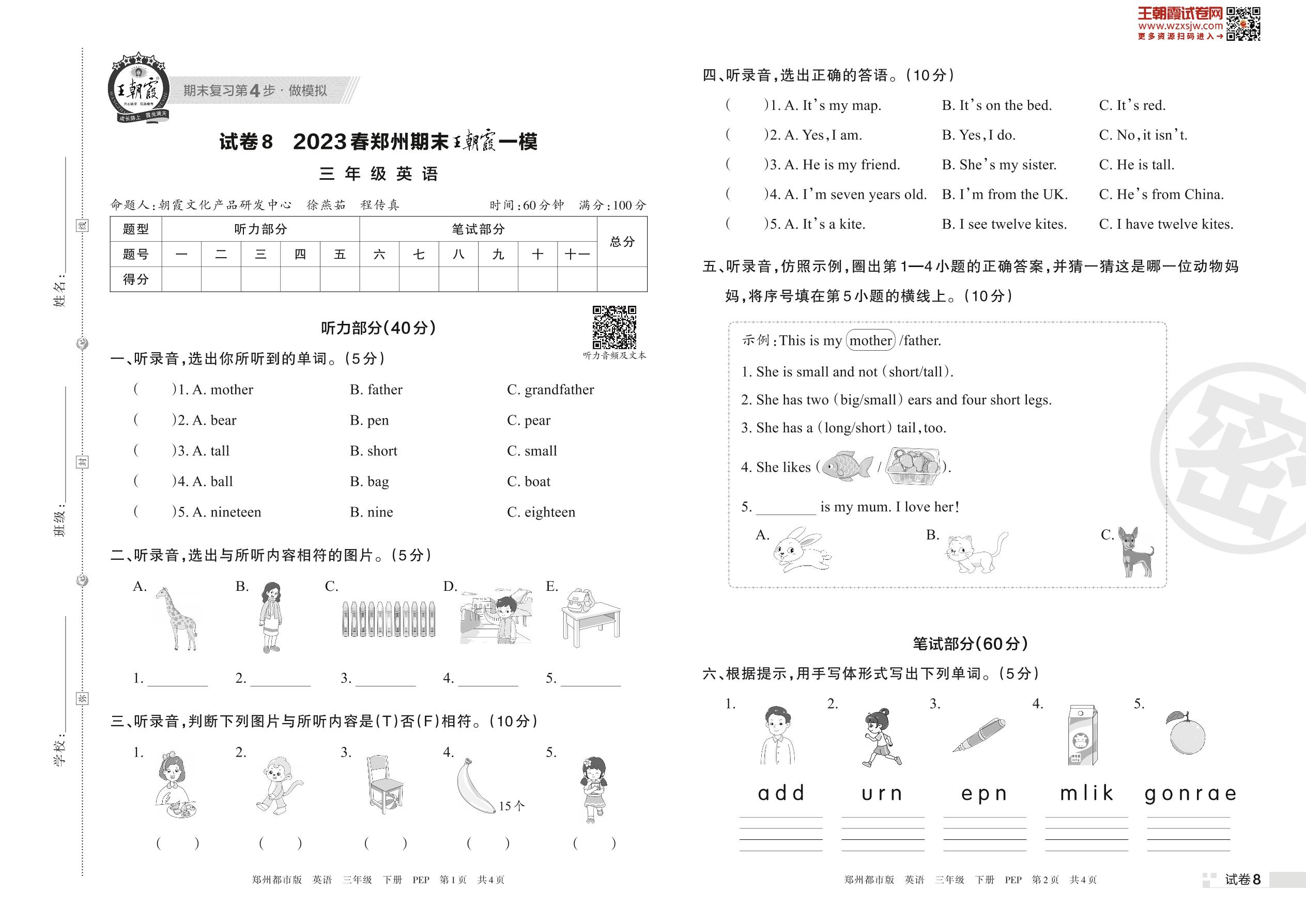 王朝霞期末模拟卷三年级下册英语(PEP版)_R230424171827872【8】