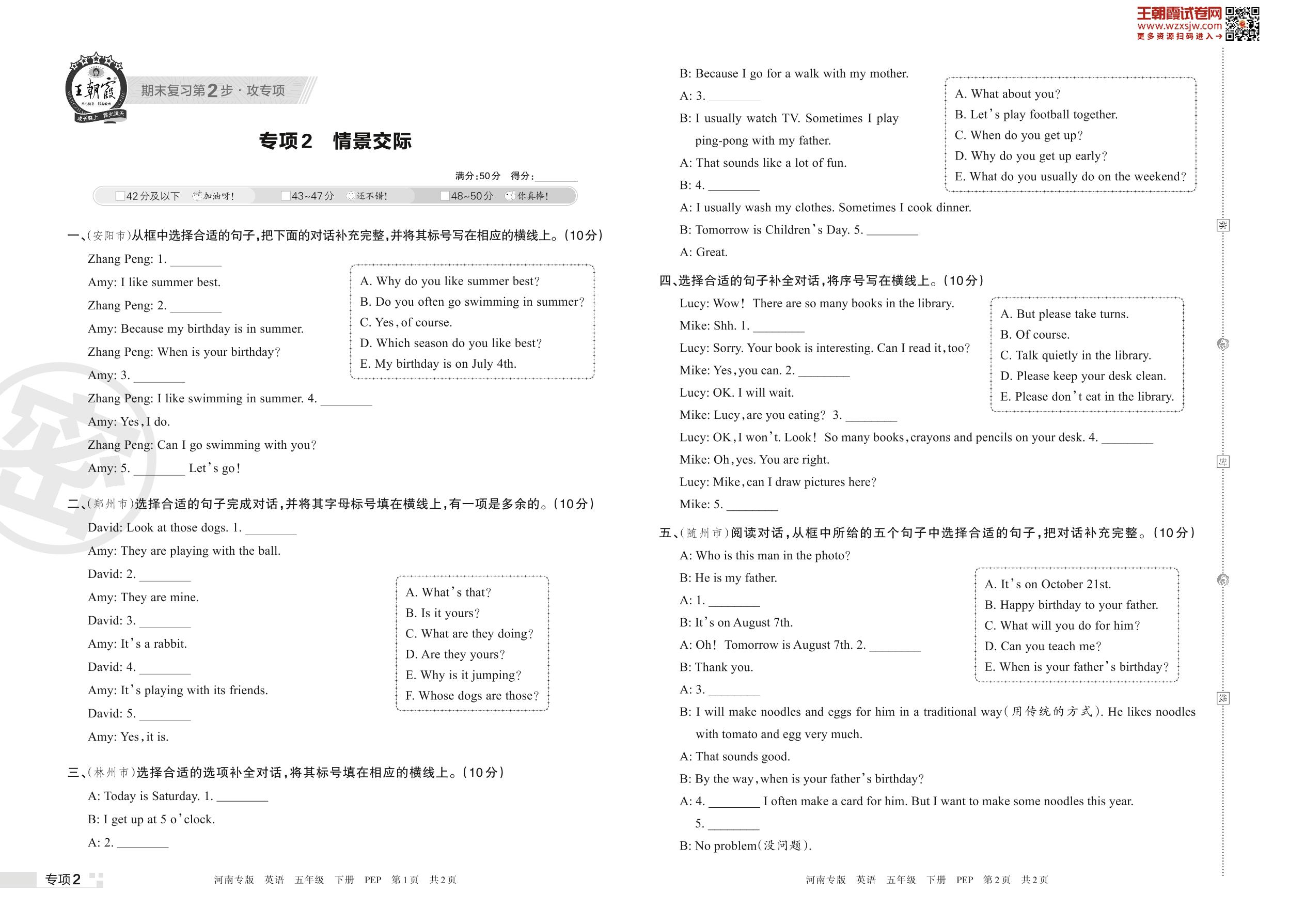 王朝霞期末专项卷——情景交际五年级下册英语(PEP版)_R230424171832319【2】