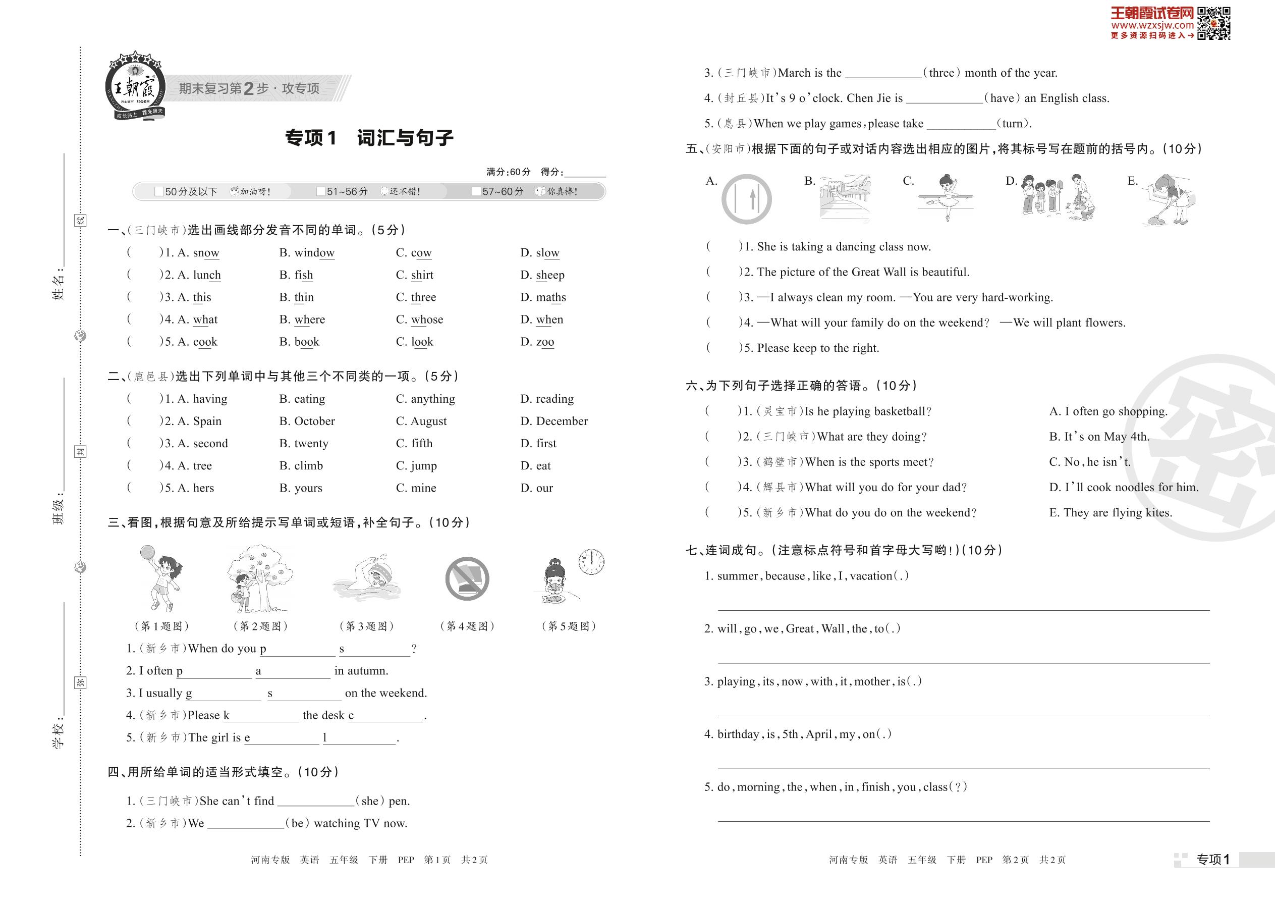 王朝霞期末专项卷——词汇与句子五年级下册英语(PEP版)_R230424171832590【1】