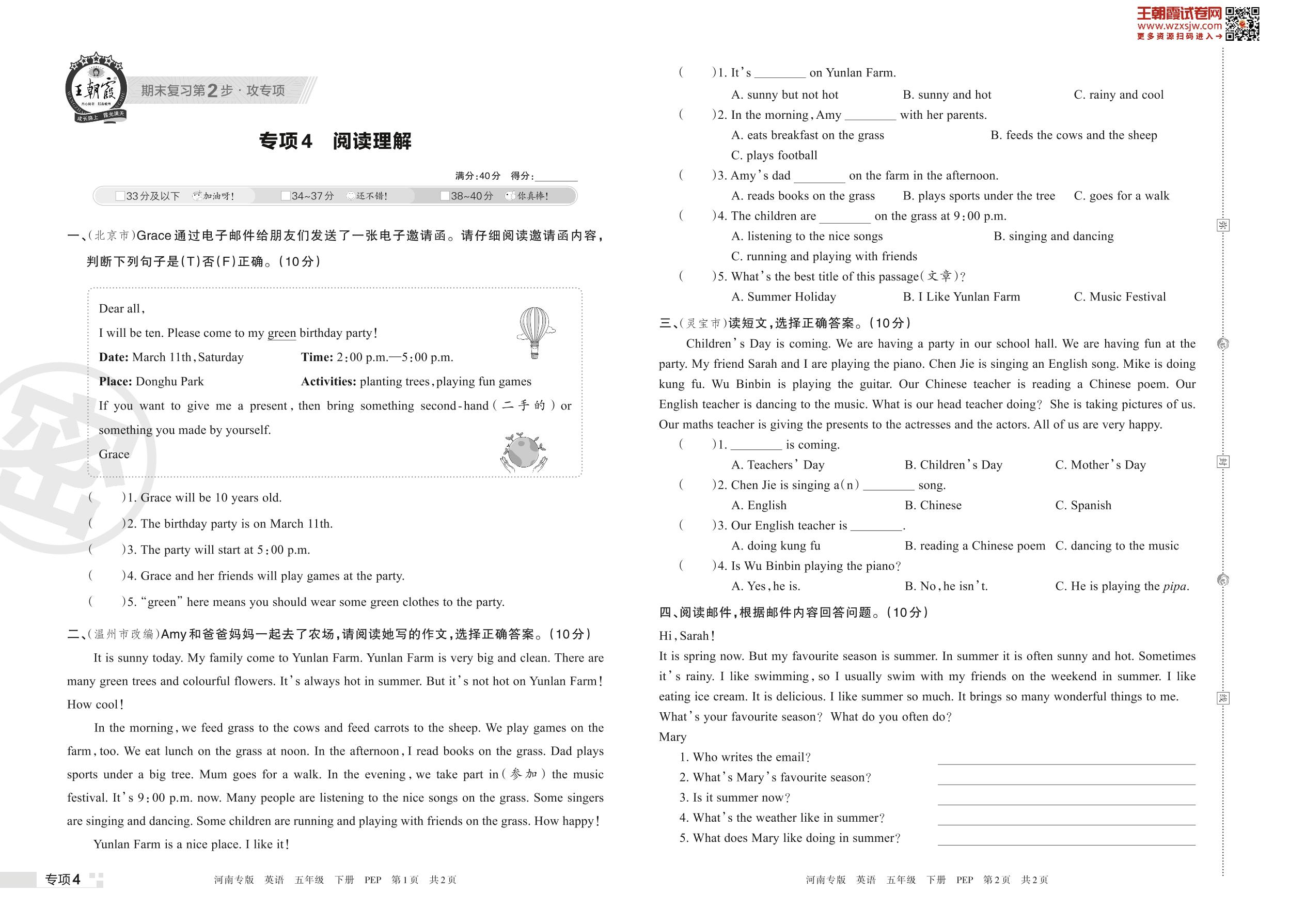 王朝霞期末专项卷——阅读理解五年级下册英语(PEP版)_R230424171832990【4】