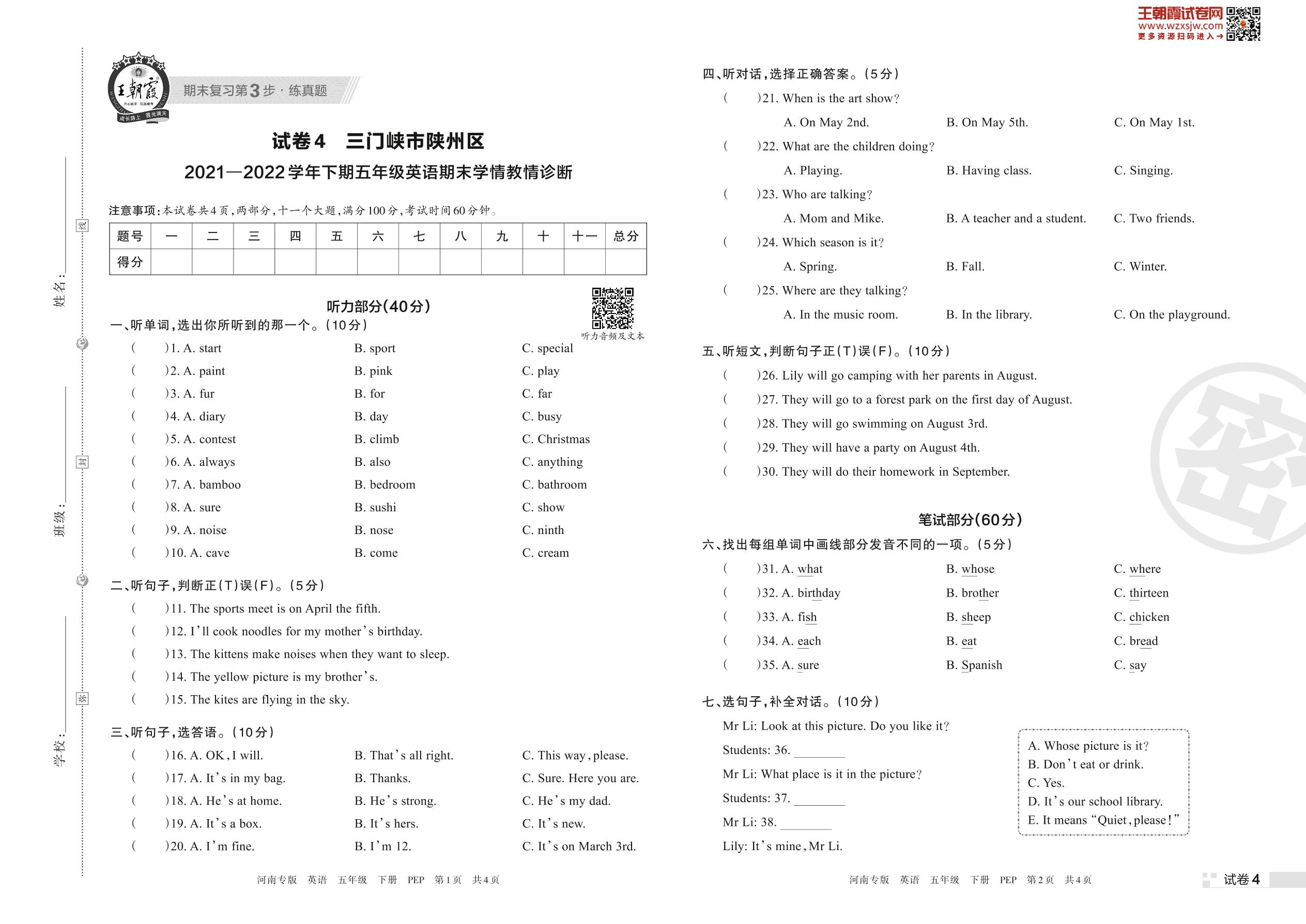 三门峡市陕州区2021—2022学年下期五年级英语期末学情教情诊断(PEP版)【4】