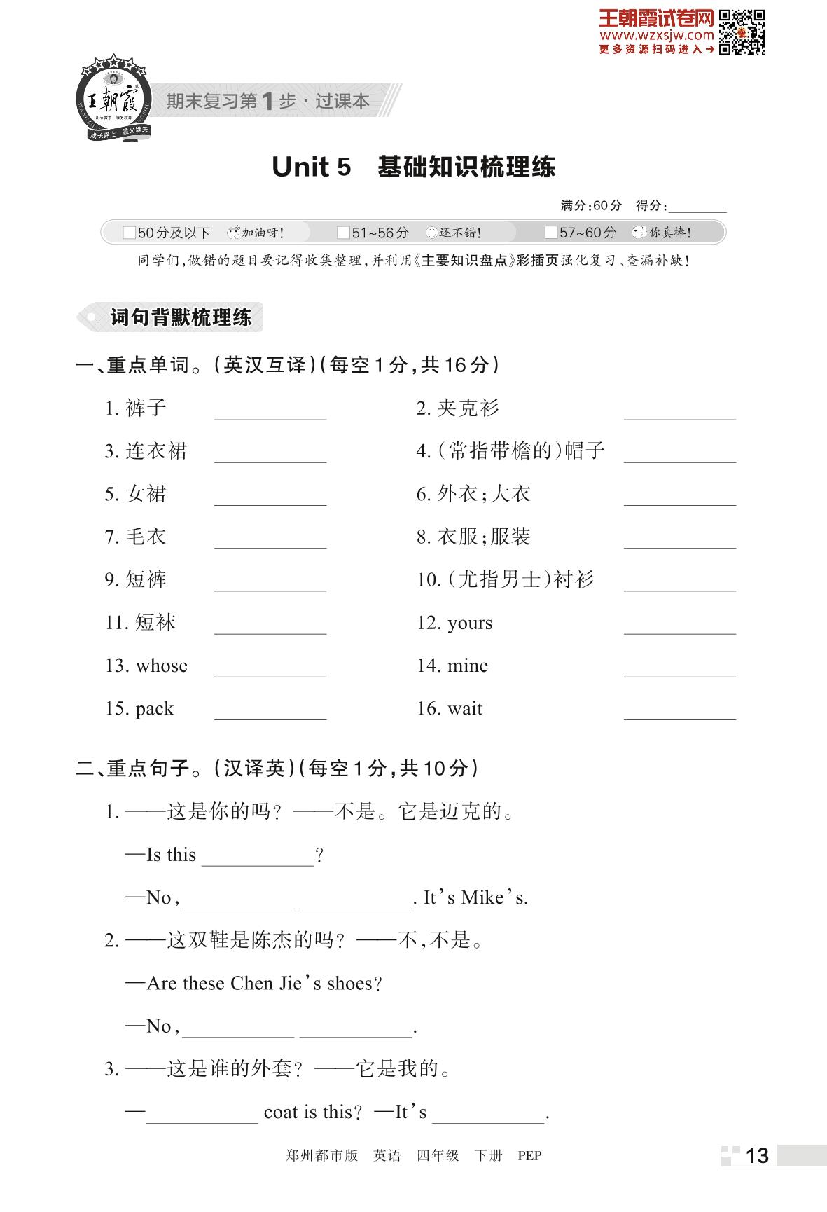 王朝霞期末过课本——Unit 5 基础知识梳理练四年级下册英语(PEP版)_R230424172307470