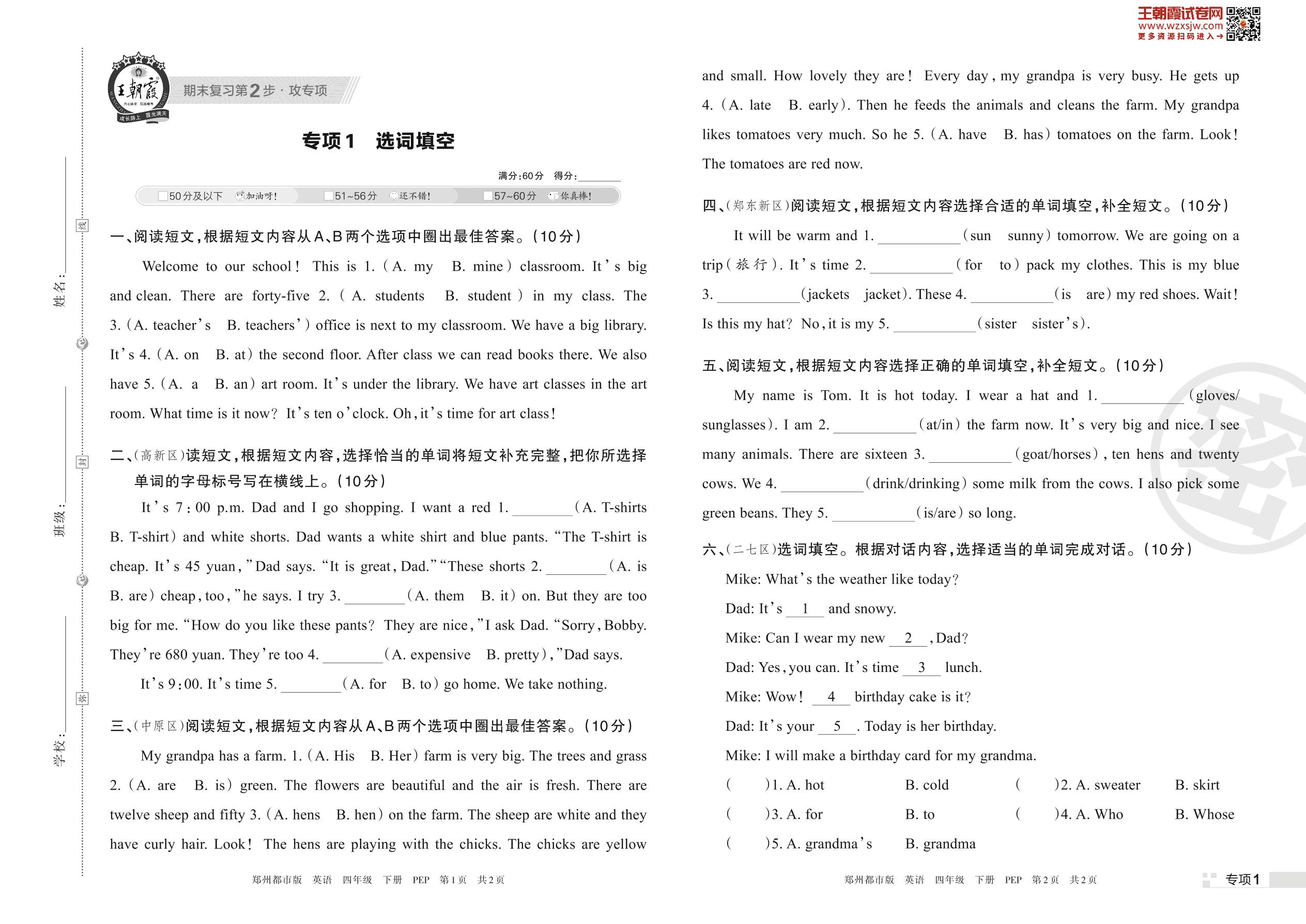 王朝霞期末专项卷——选词填空四年级下册英语(PEP版)_R230424172308912【1】