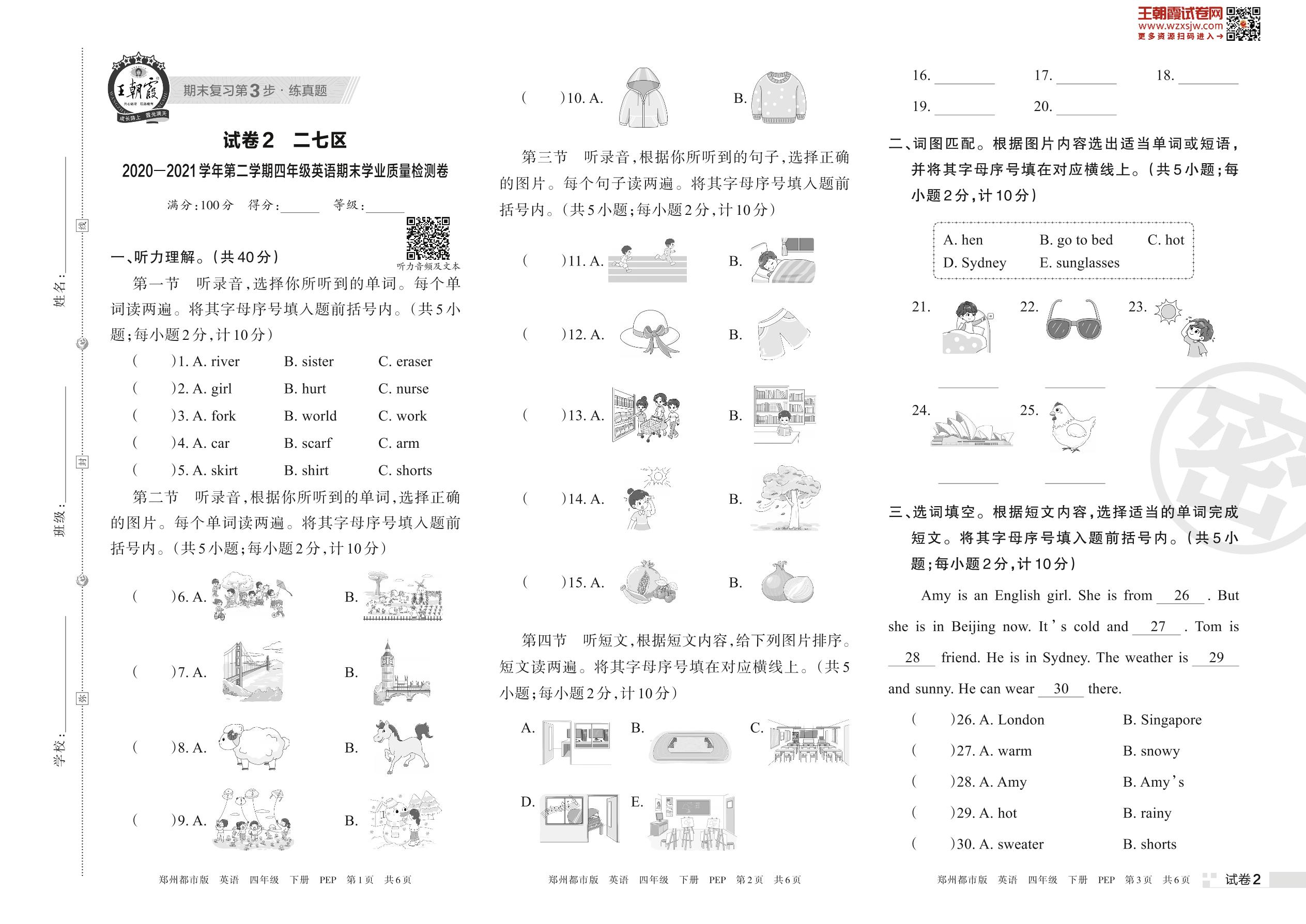 二七区2020—2021学年第二学期四年级英语期末学业质量检测卷(PEP版)【2】