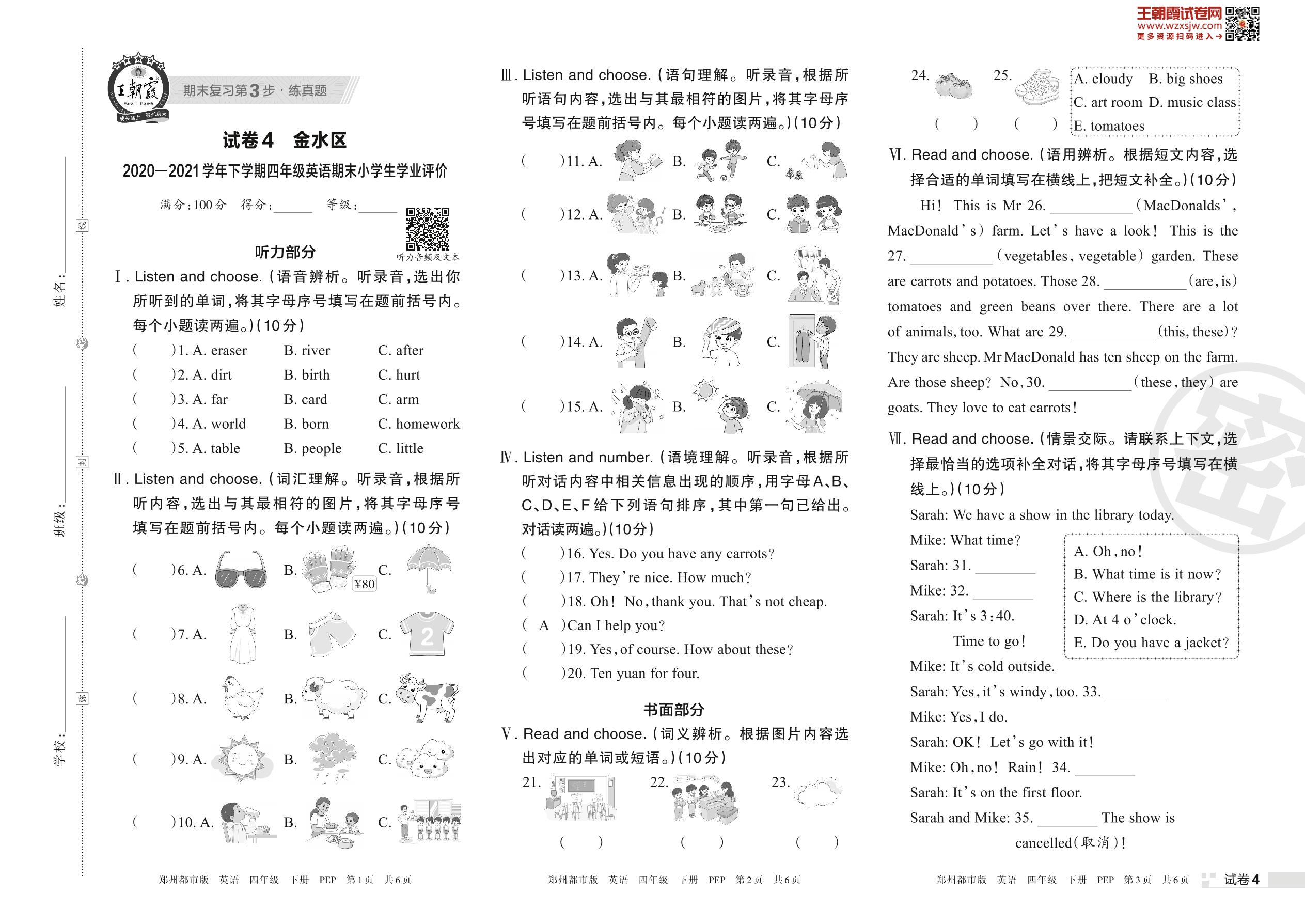 金水区2020—2021学年下学期四年级英语期末小学生学业评价(PEP版)【4】