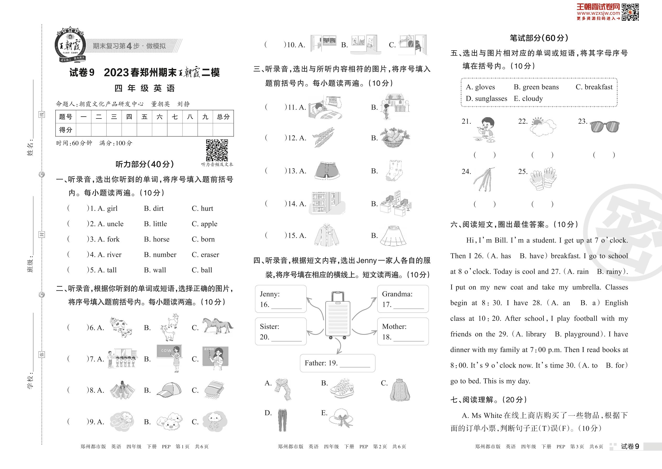 王朝霞期末模拟卷四年级下册英语(PEP版)_R230424172309098【9】