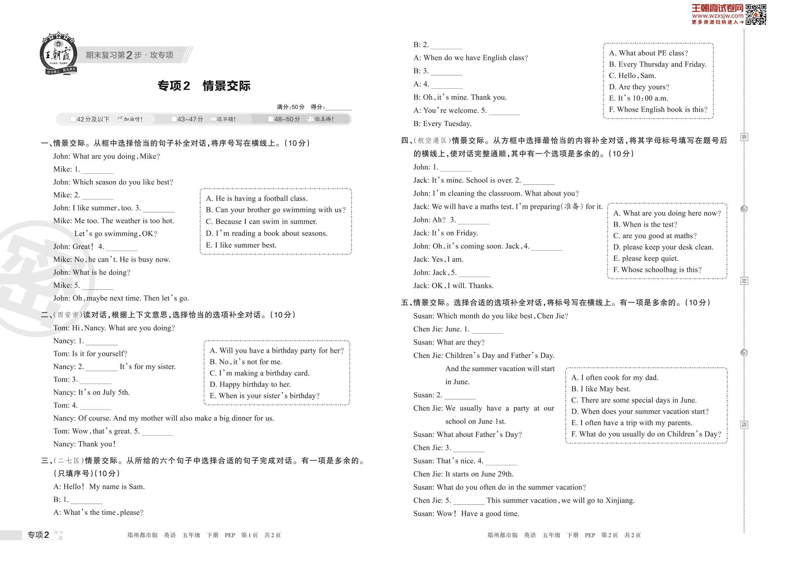 王朝霞期末专项卷——情景交际五年级下册英语(PEP版)_R230424172736244【2】
