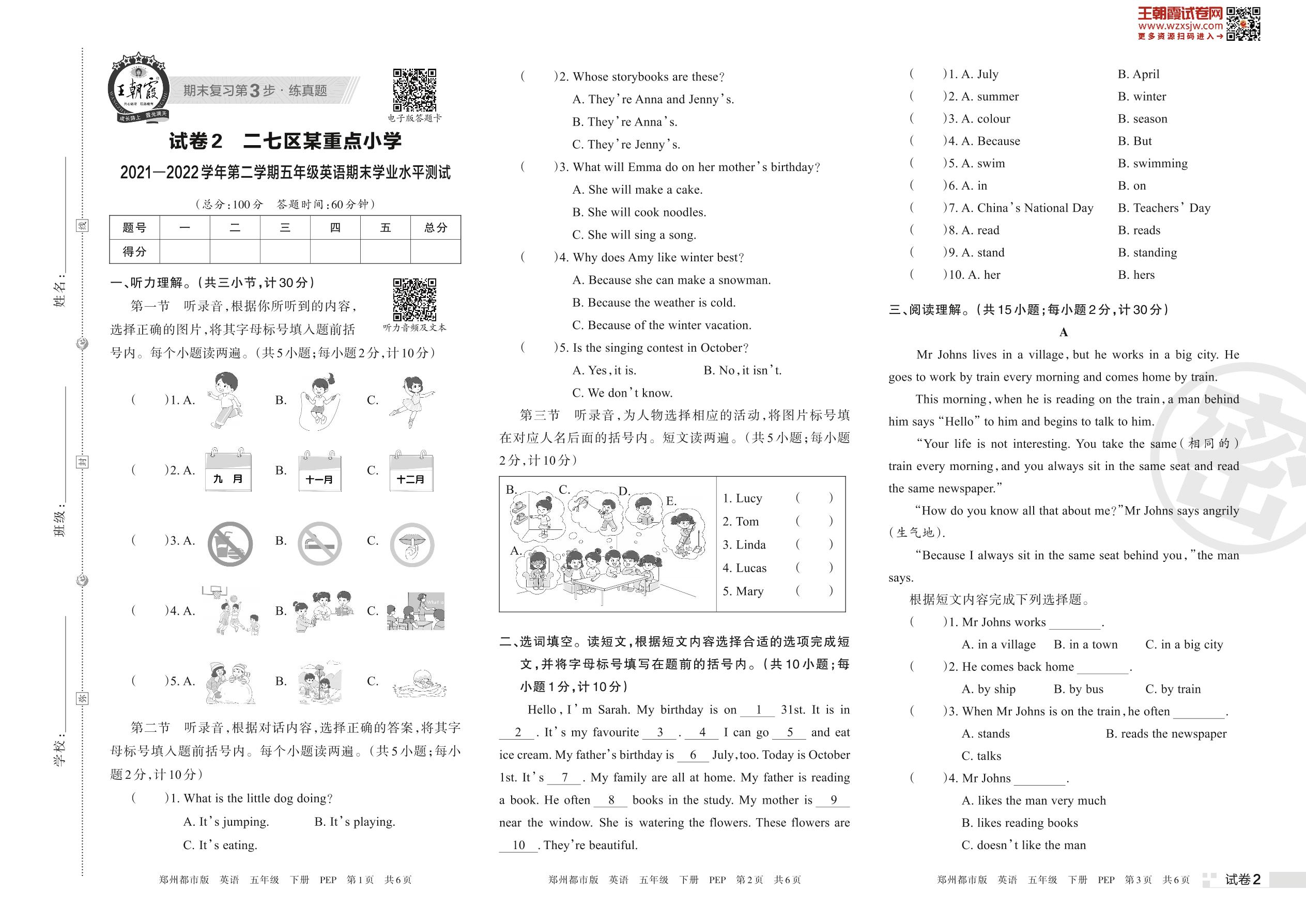 二七区某重点小学2021—2022学年第二学期五年级英语期末学业水平测试(PEP版)【2】