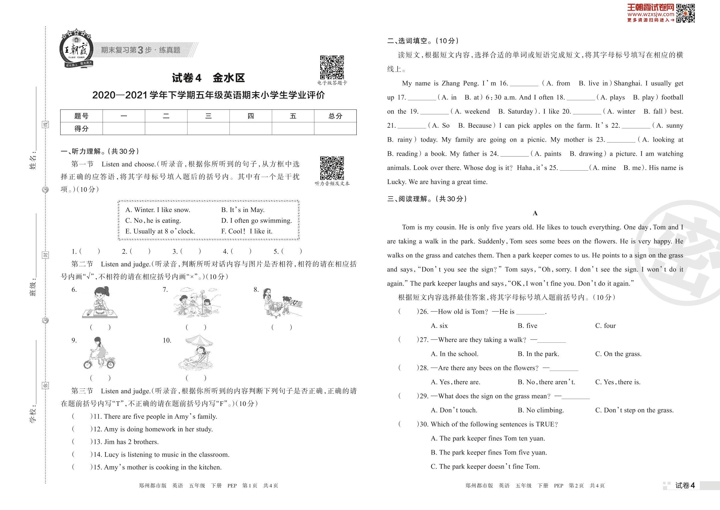 金水区2020—2021学年下学期五年级英语期末小学生学业评价(PEP版)【4】