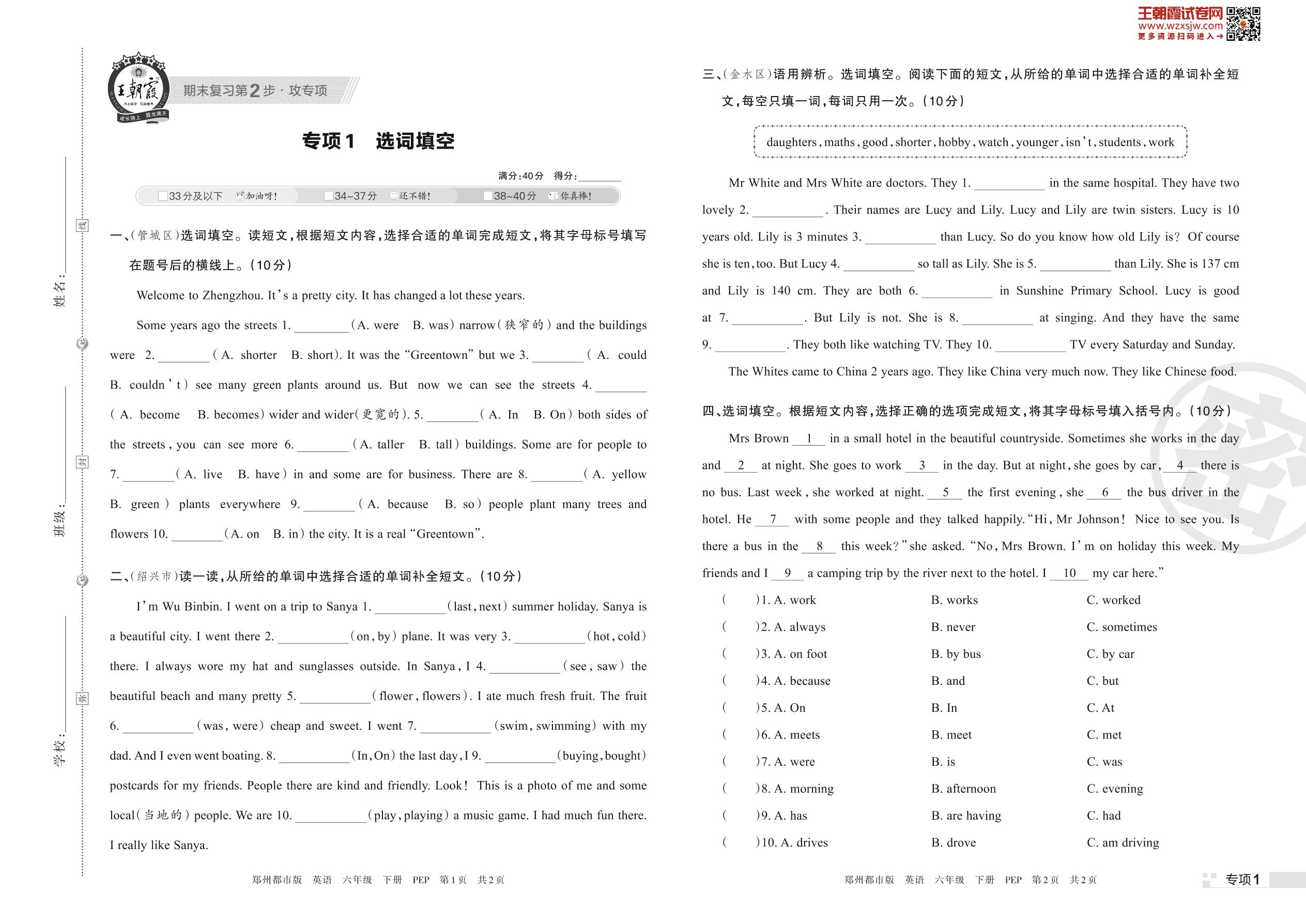 王朝霞期末专项卷——选词填空六年级下册英语(PEP版)_R230424173212288【1】