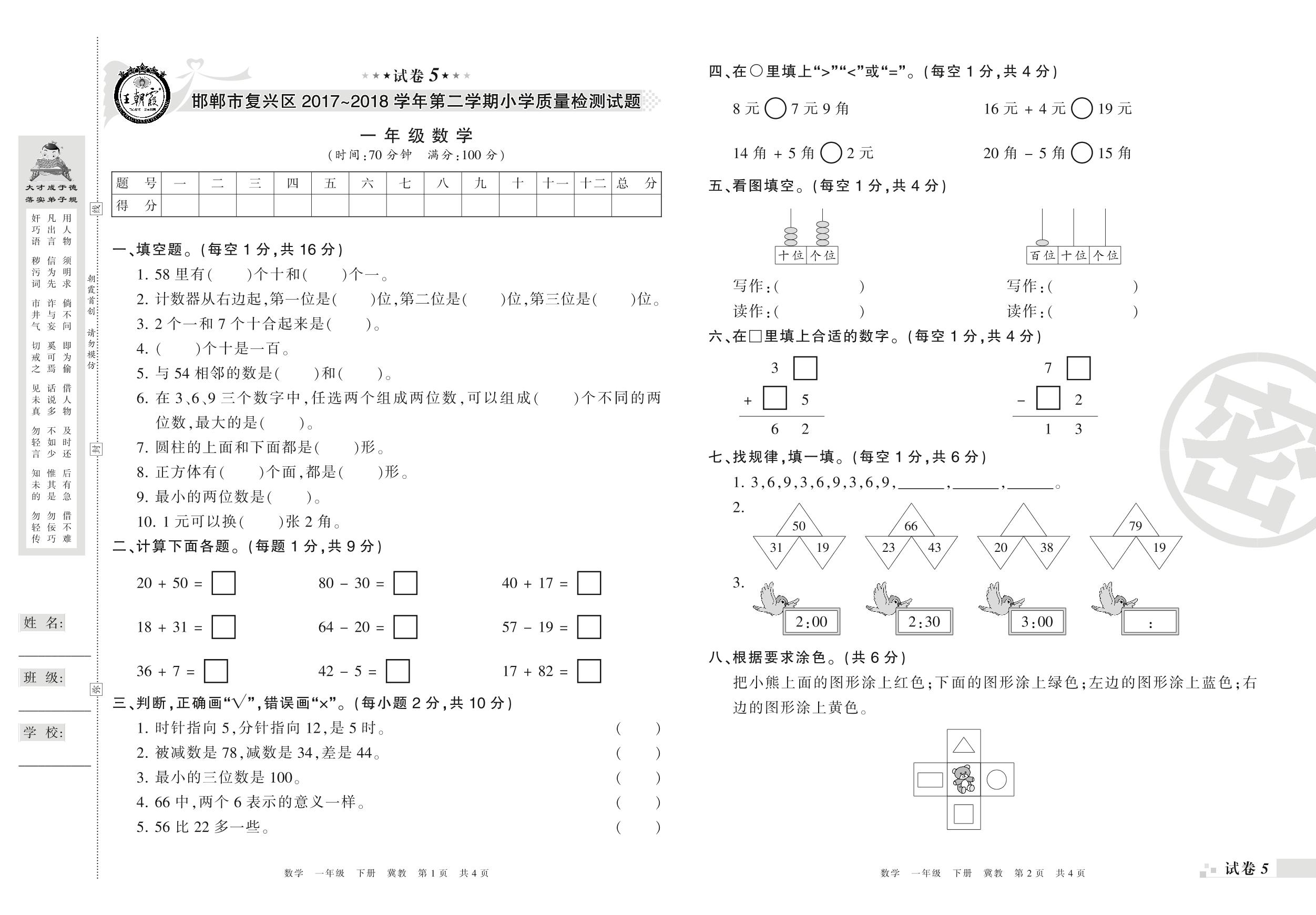 2017-2018学年第二学期邯郸市复兴区一年级数学试卷(冀教版)【5】