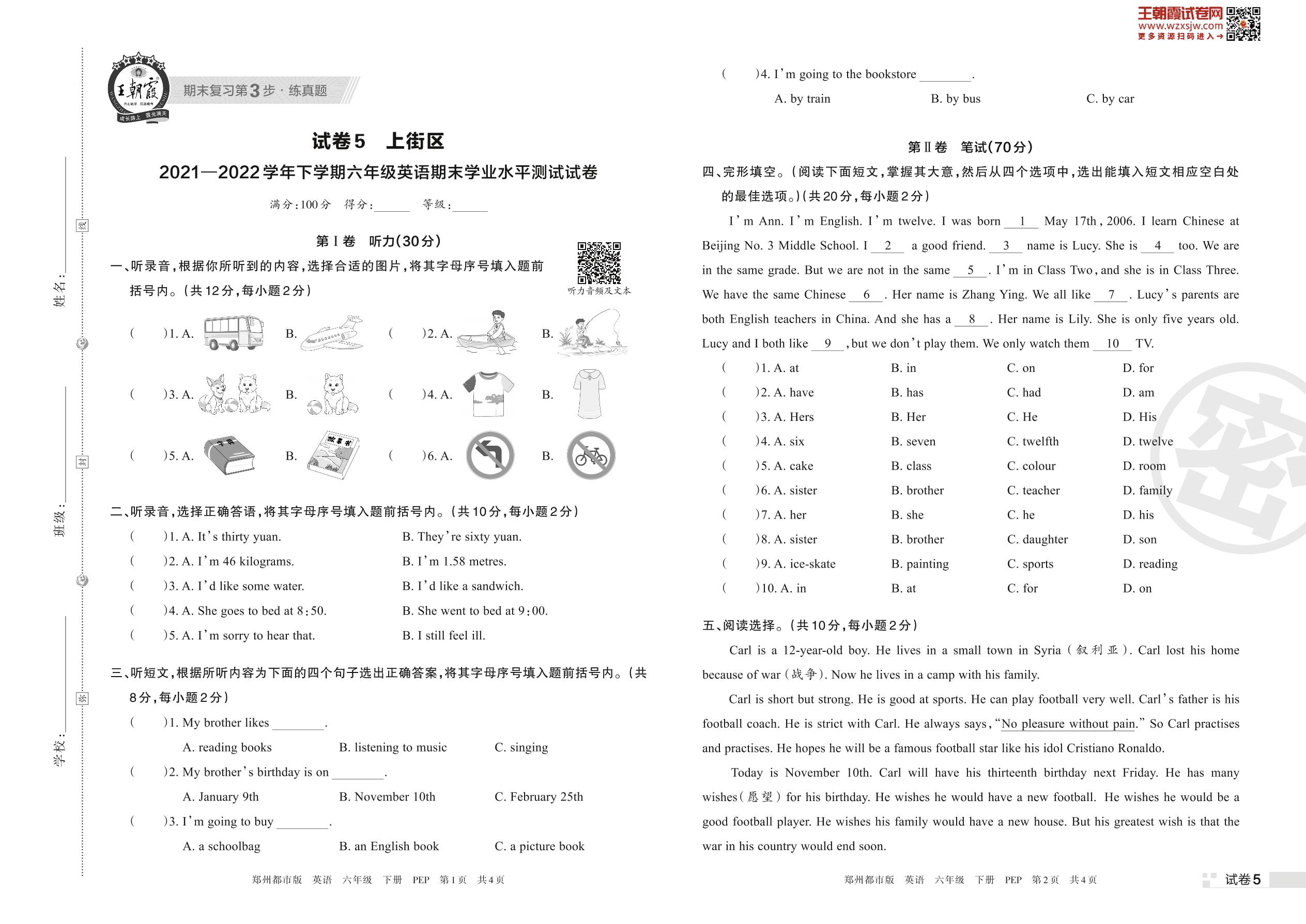 六年级英语人教PEP版(三起始)下册期末卷