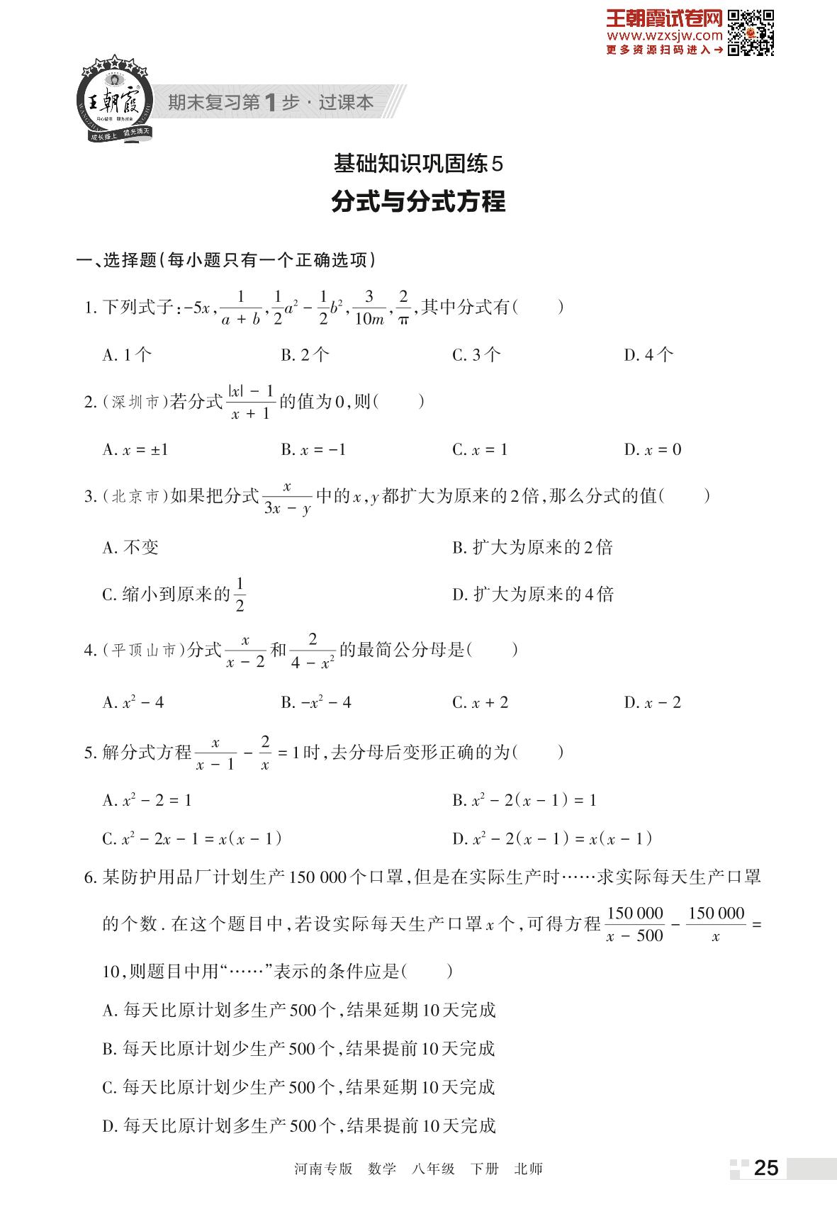 王朝霞期末过课本——基础知识巩固练5 分式与分式方程八年级下册数学(北师版)_R230424173318131