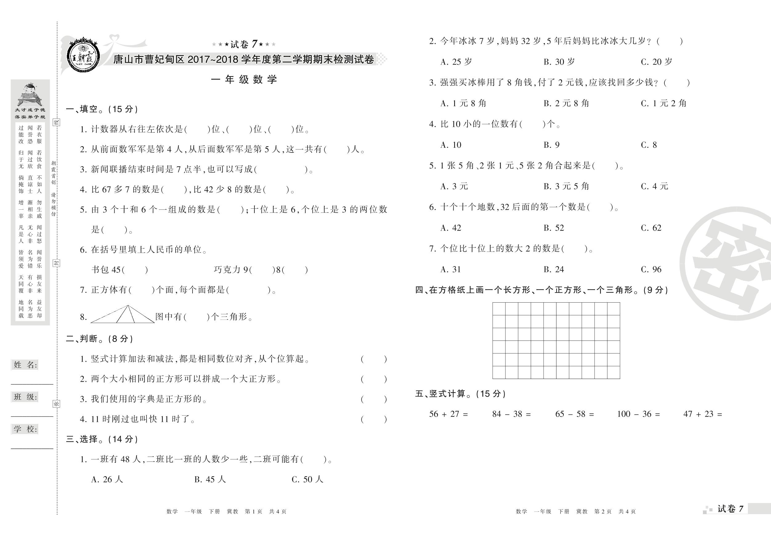 2017-2018学年第二学期唐山市曹妃甸区一年级数学试卷(冀教版)【7】