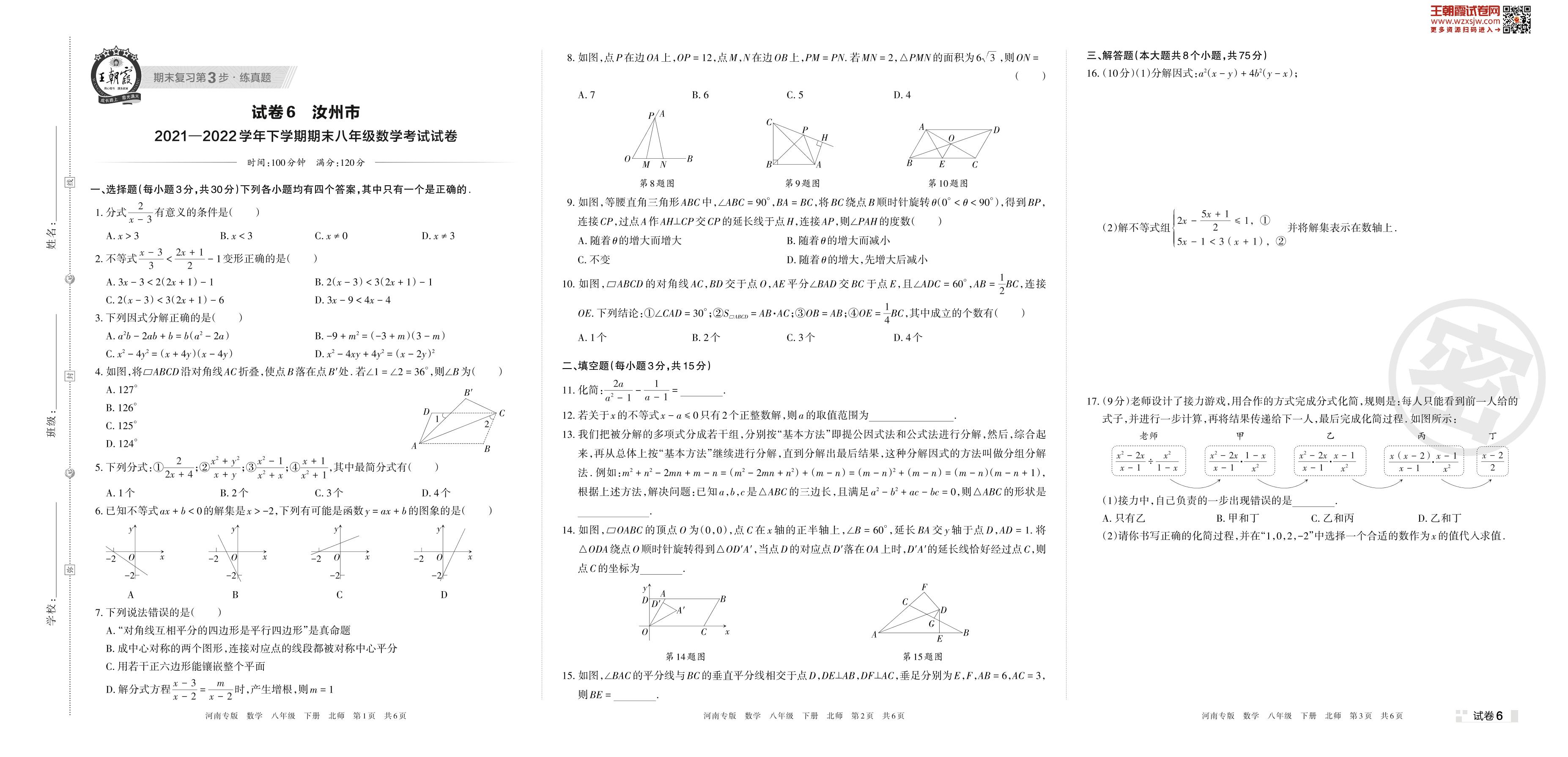 汝州市2021—2022学年下学期期末八年级数学考试试卷(北师版)【6】