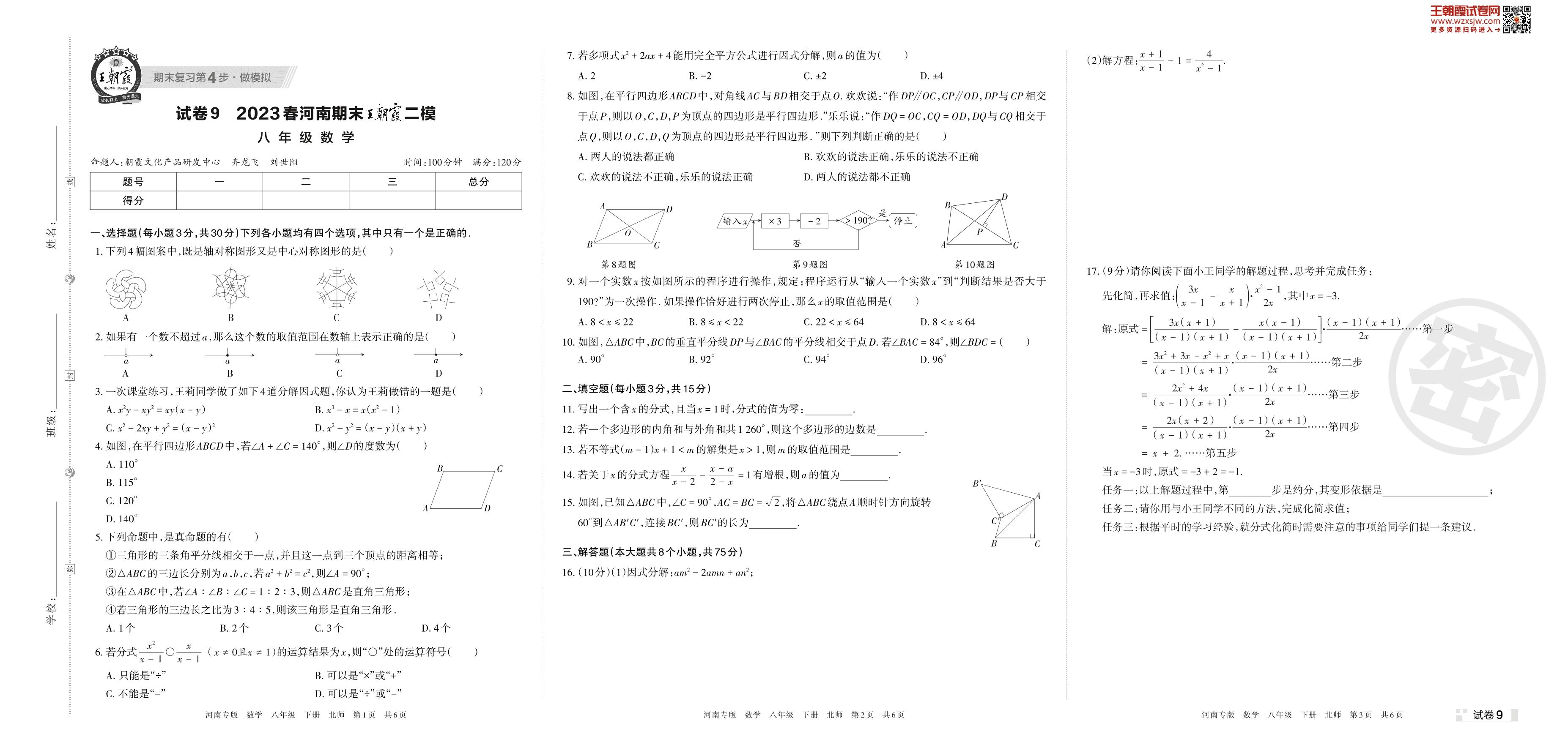 王朝霞期末模拟卷八年级下册数学(北师版)【9】