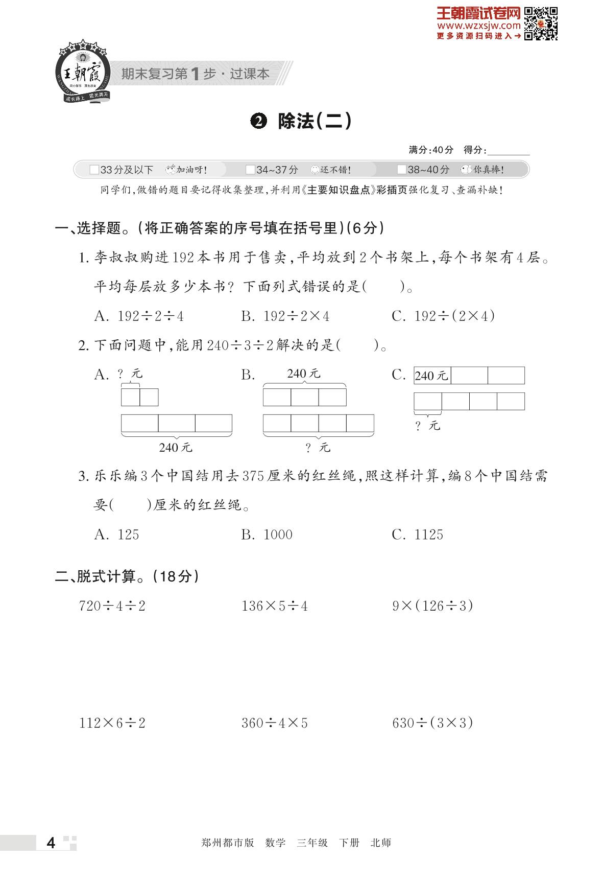 王朝霞期末过课本——2 除法(二)三年级下册数学(北师版)