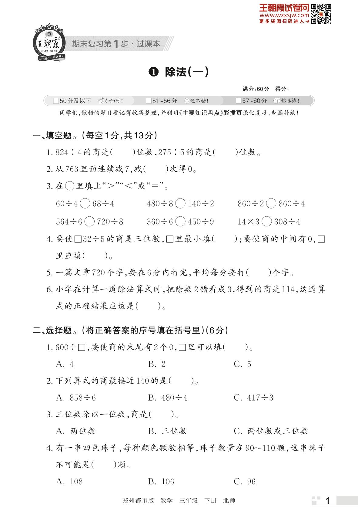 王朝霞期末过课本——1 除法(一)三年级下册数学(北师版)