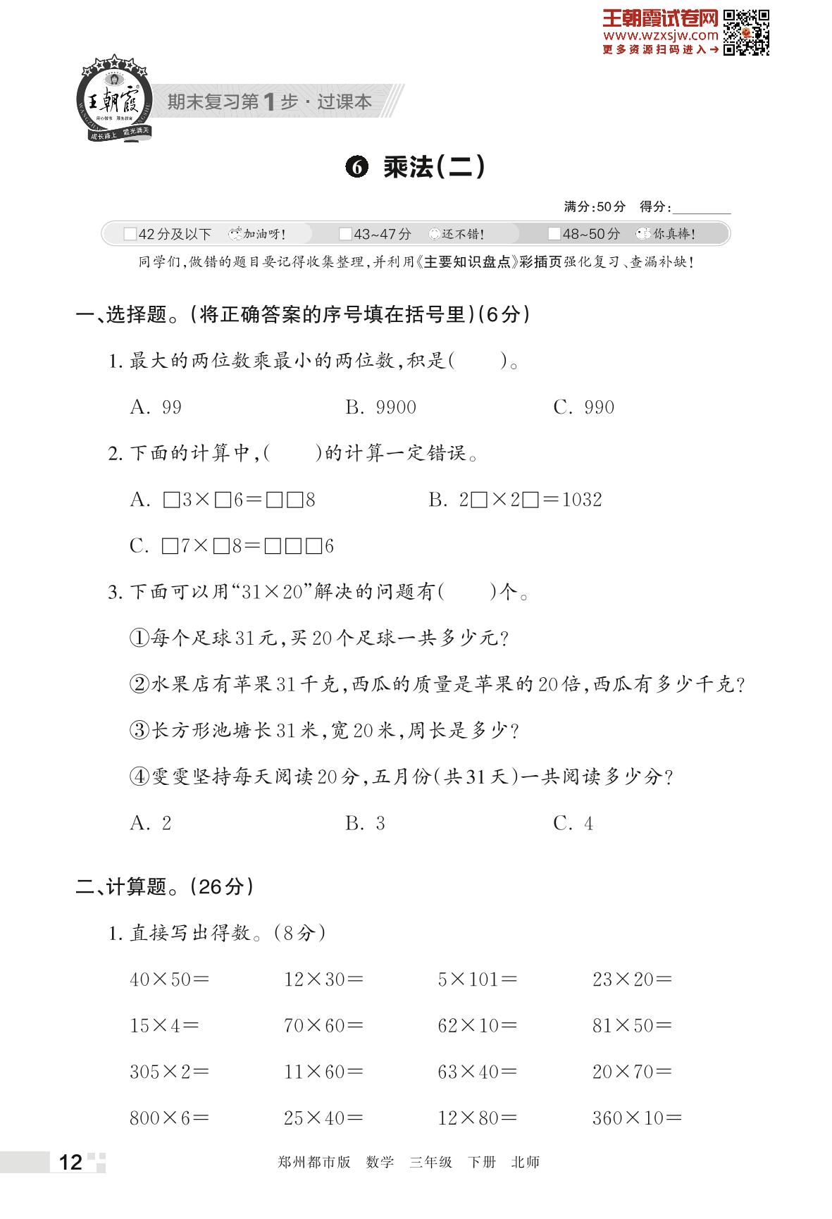 王朝霞期末过课本——6 乘法(二)三年级下册数学(北师版)