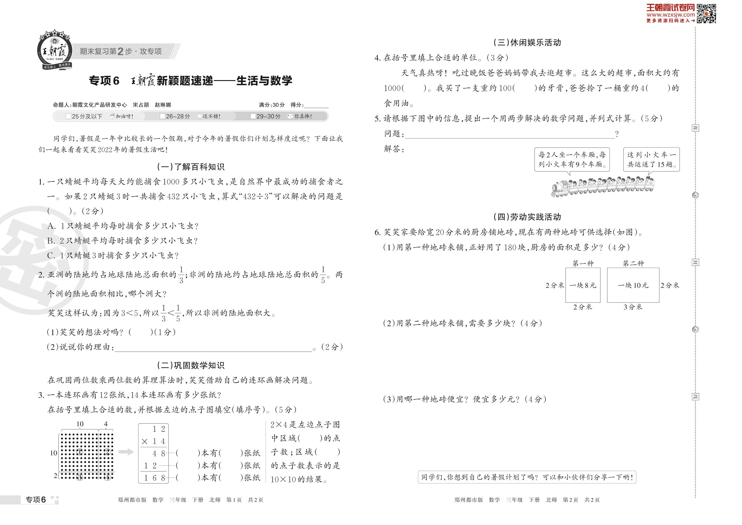 王朝霞期末专项卷——王朝霞新颖题速递:生活与数学三年级下册数学(北师版)【6】