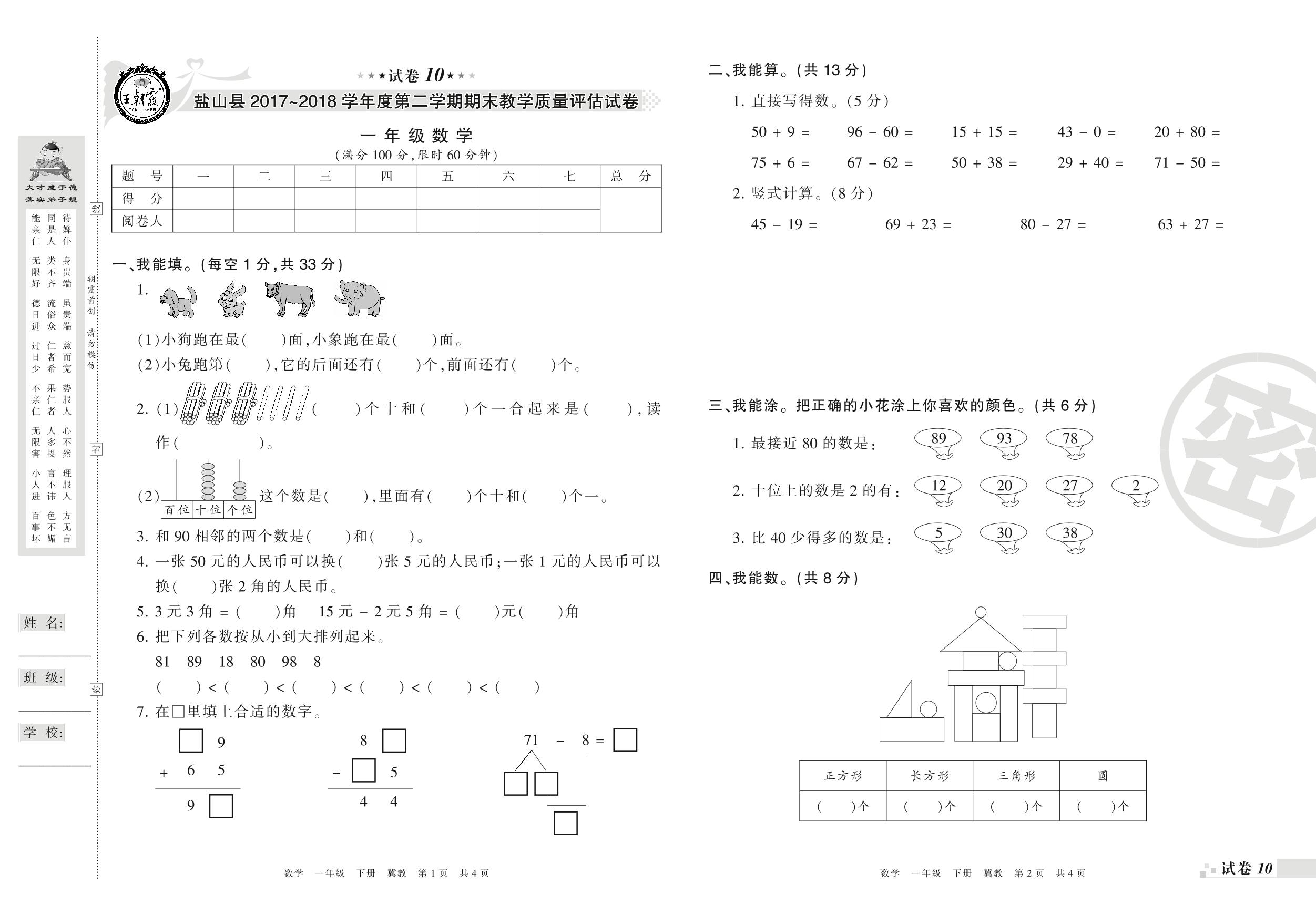2017-2018学年第二学期沧州市盐山县一年级数学试卷(冀教版)【10】