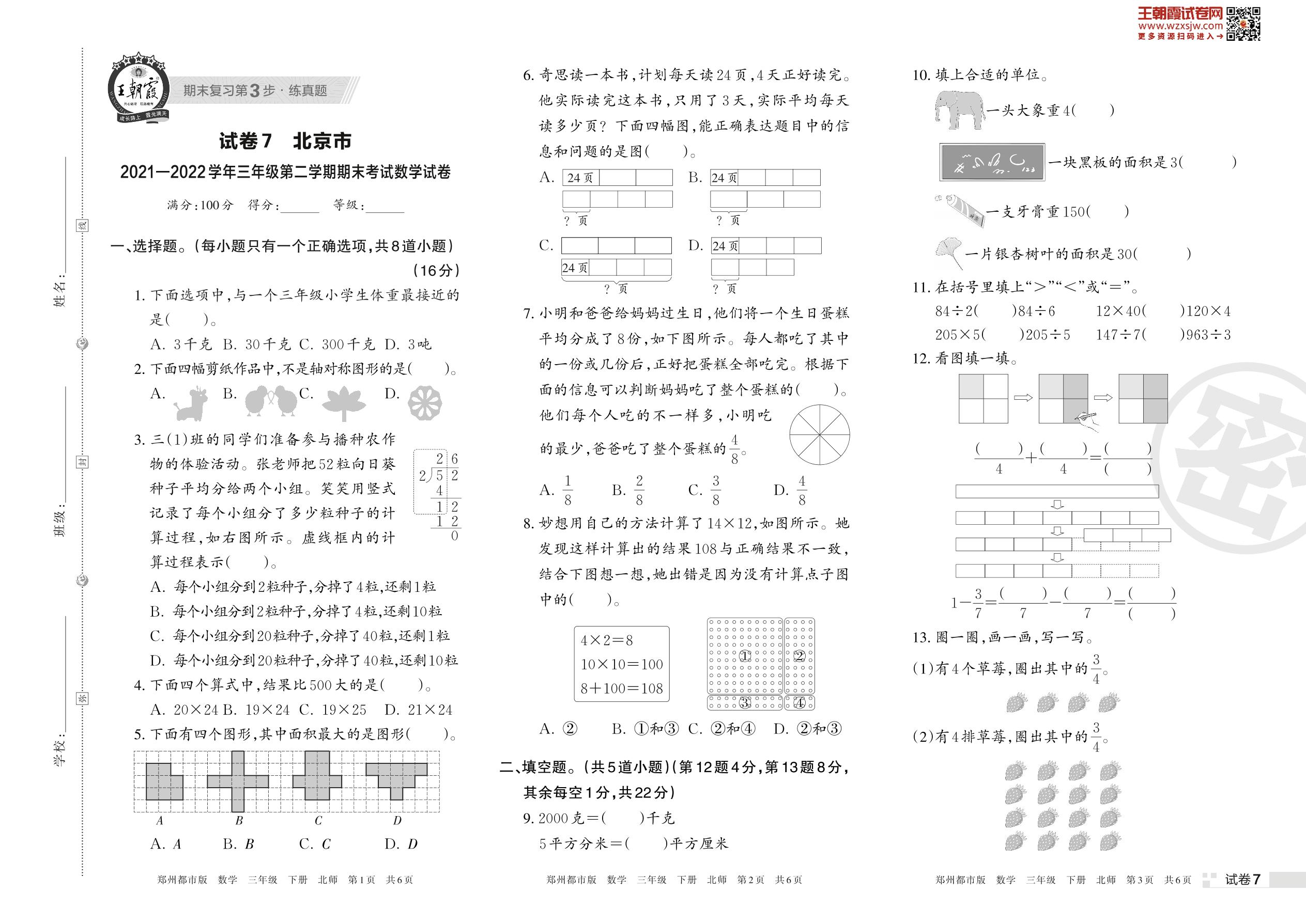 北京市2021—2022学年三年级第二学期期末考试数学试卷(北师版)【7】
