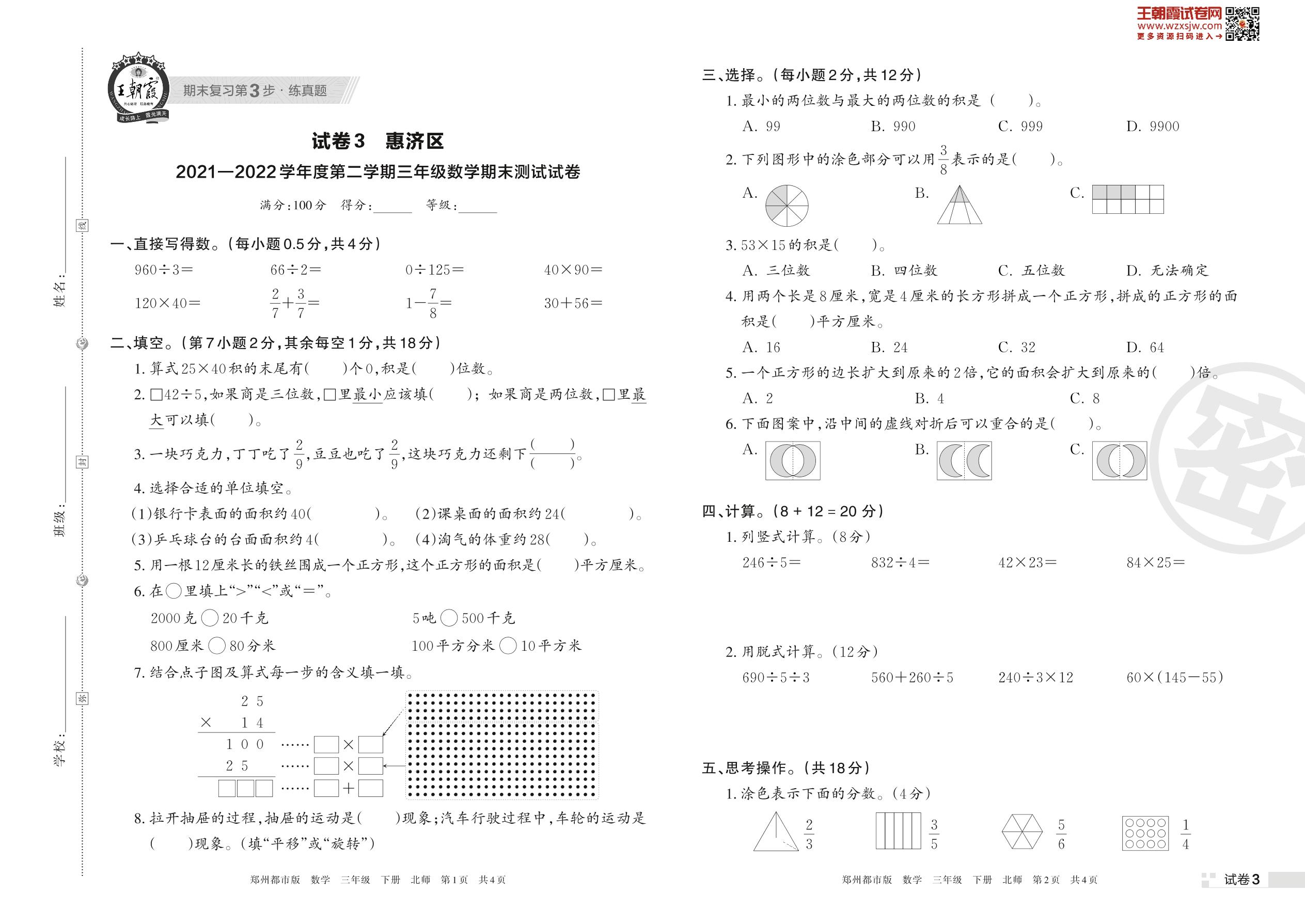 惠济区2021—2022学年度第二学期三年级数学期末测试试卷(北师版)【3】