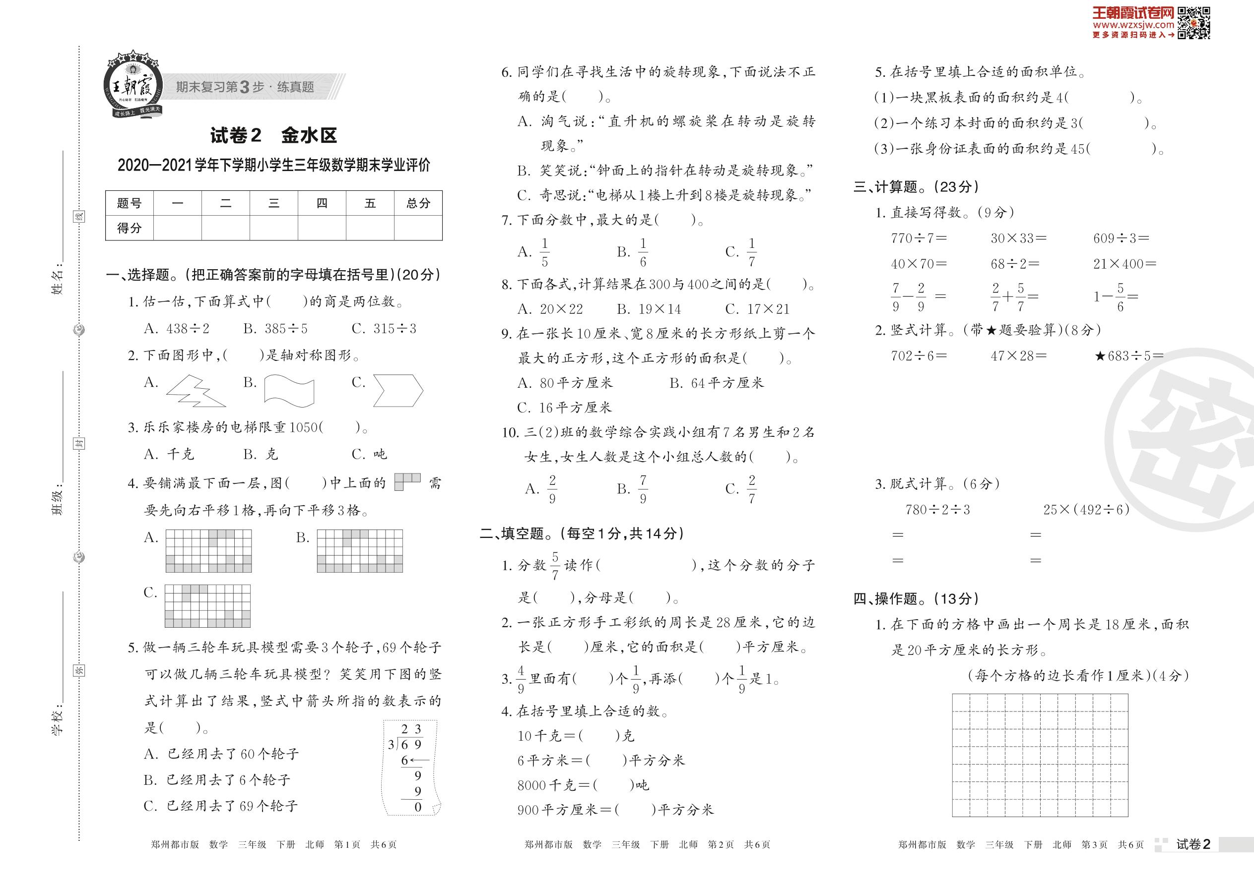 金水区2020—2021学年下学期小学生三年级数学期末学业评价(北师版)【2】